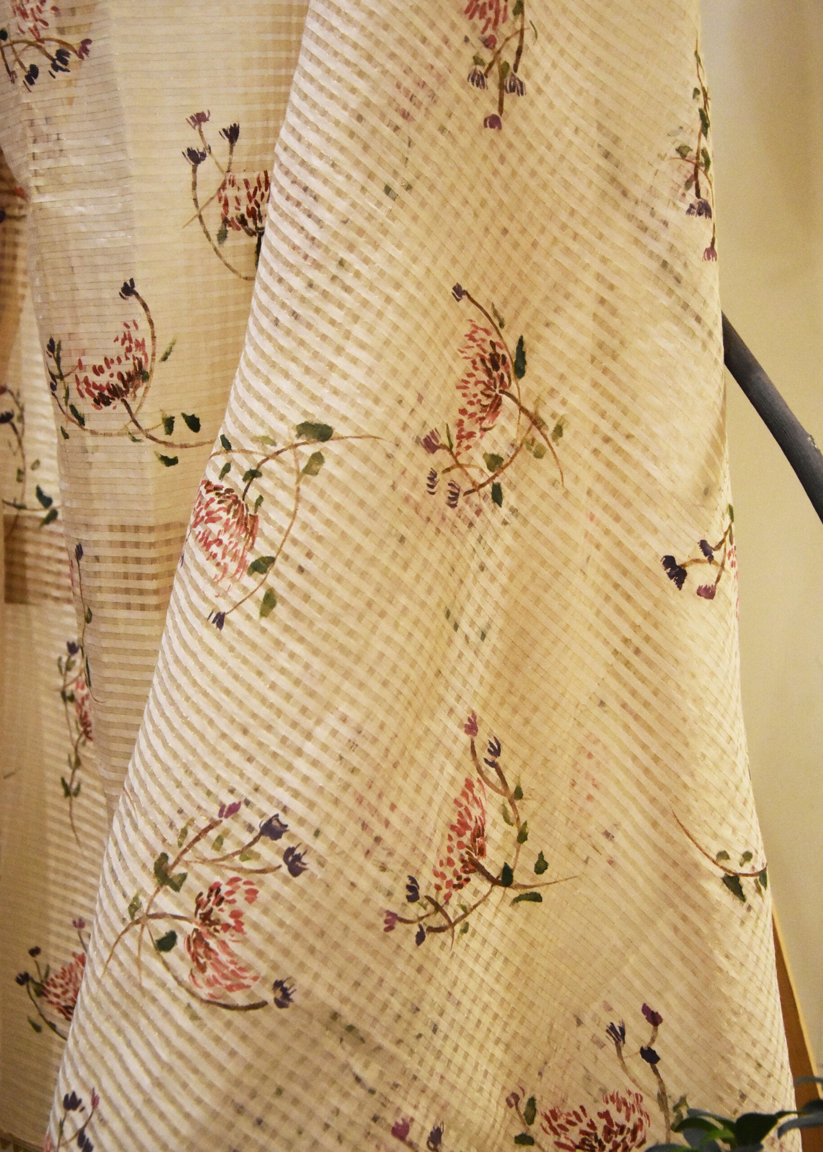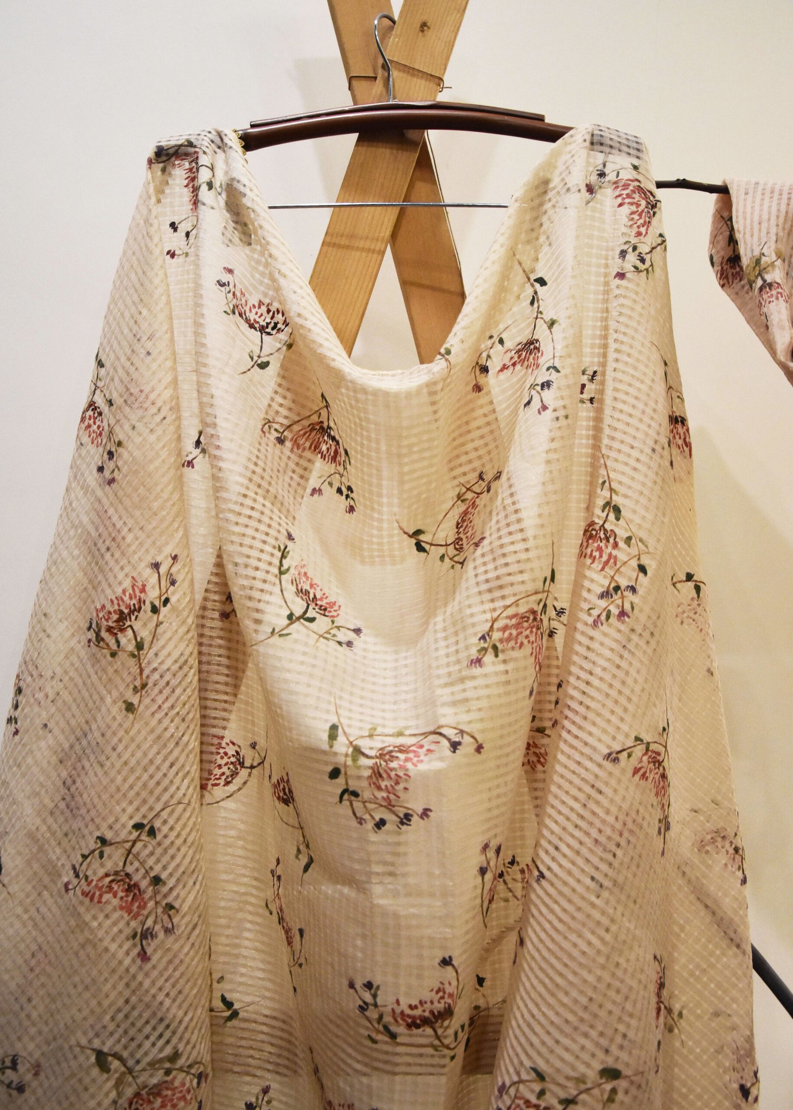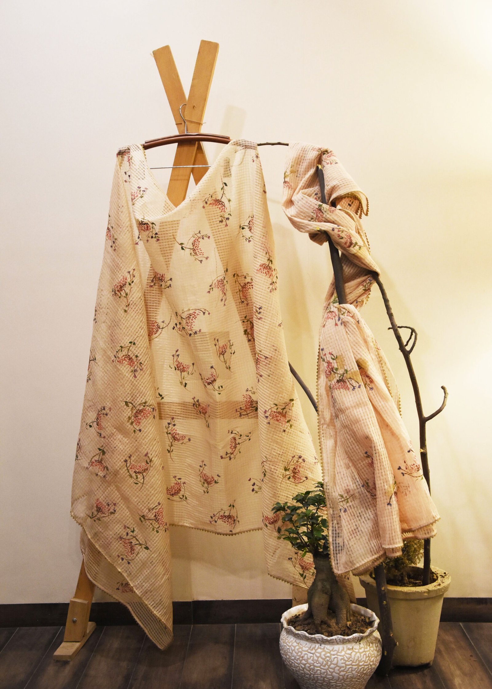 The scarf/dupatta has hand-painted spread of delicate motifs. It is made in a soothing summery kota fabric. The dupatta/scarf is soothing, sheer and as fresh as the flowers.