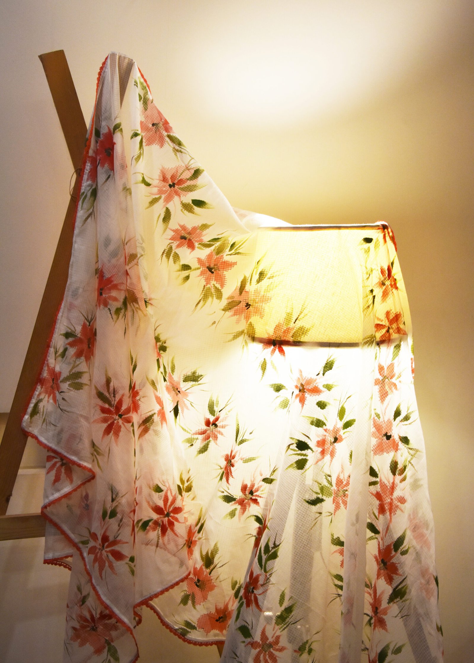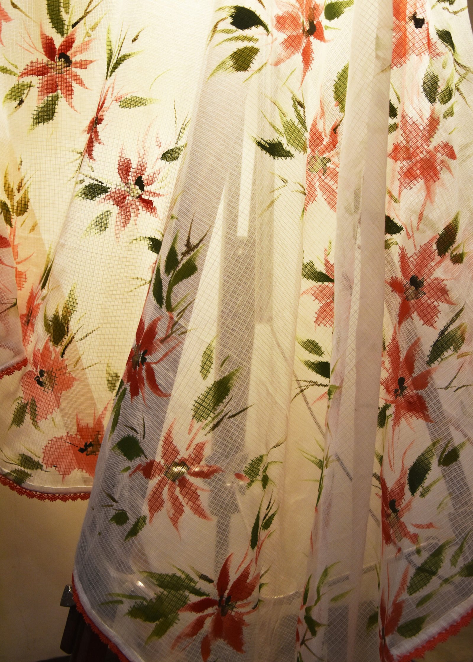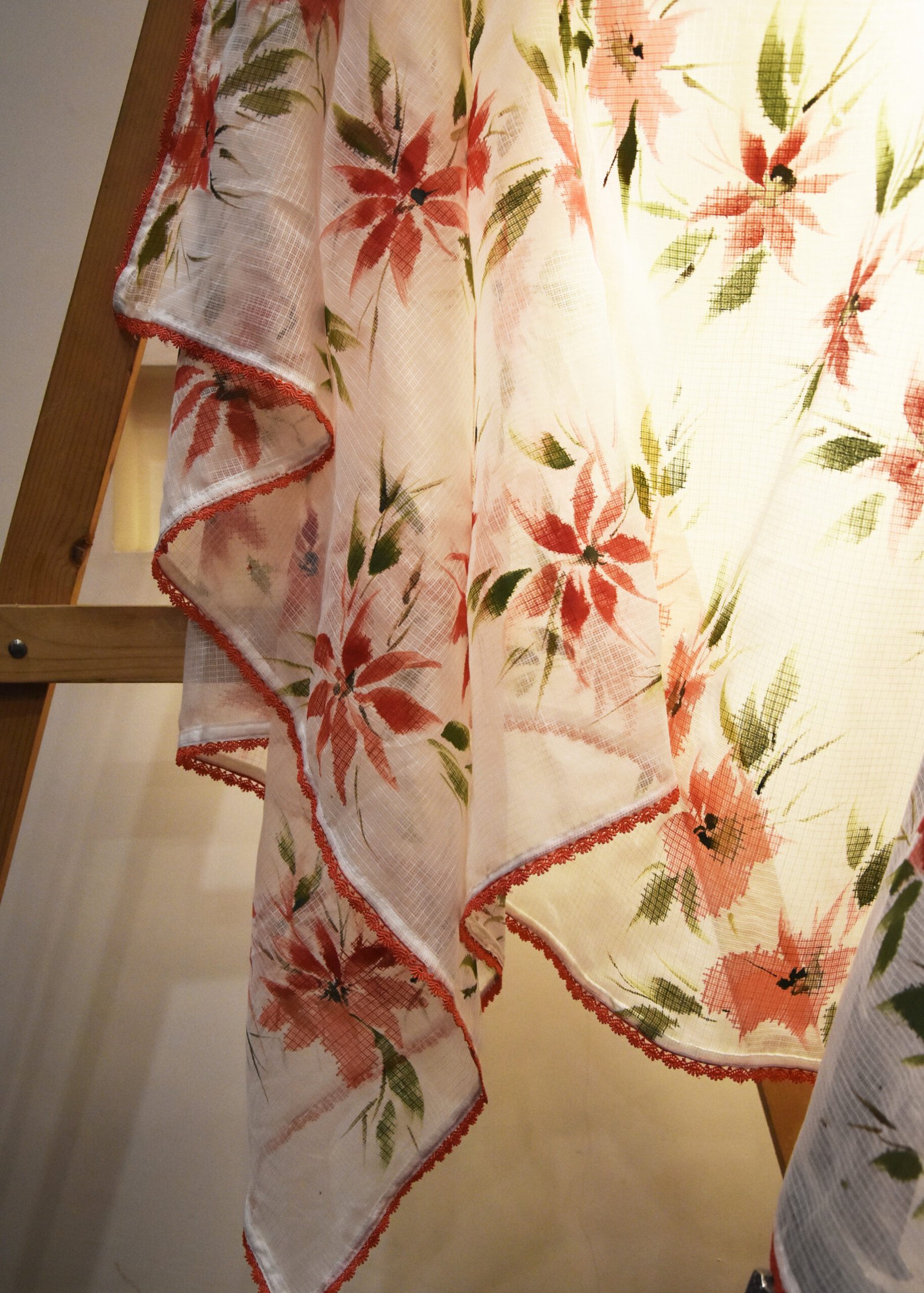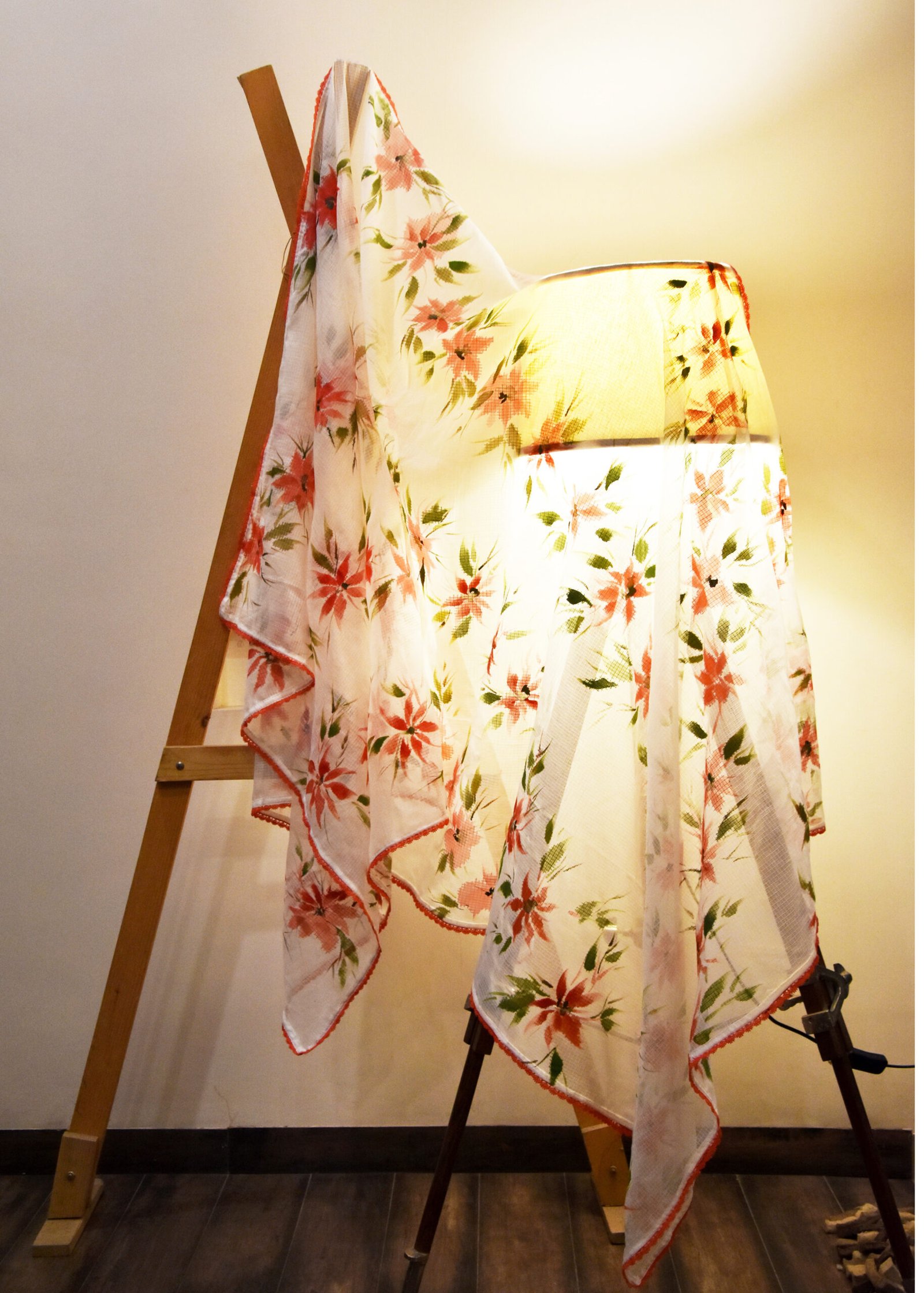 The scarf/dupatta has hand-painted spread of coral flowers in a row. It is made in a soothing summery kota fabric. The dupatta/scarf is soothing, sheer and as fresh as the flowers.