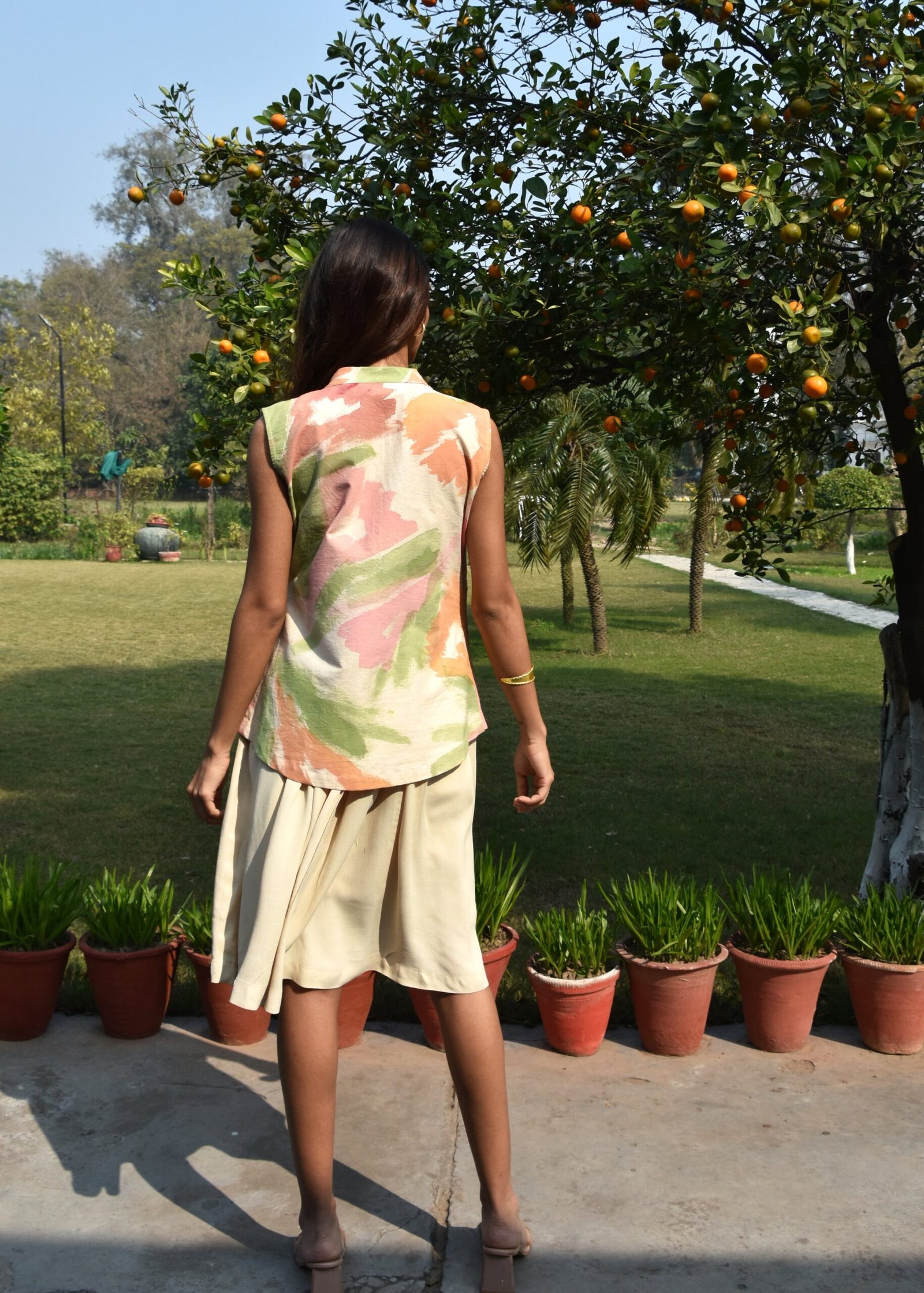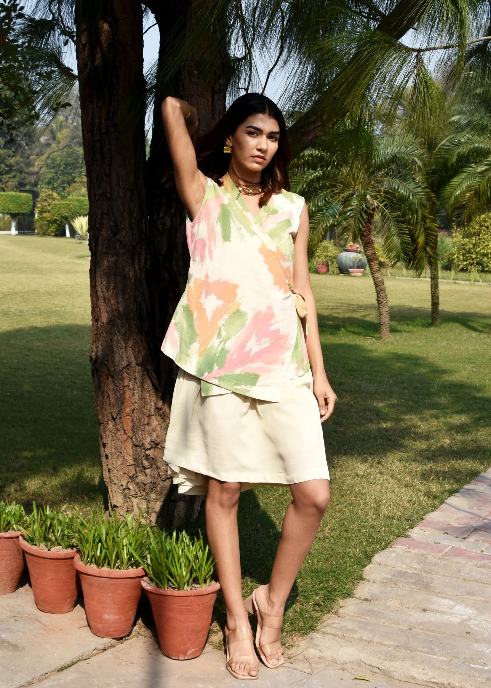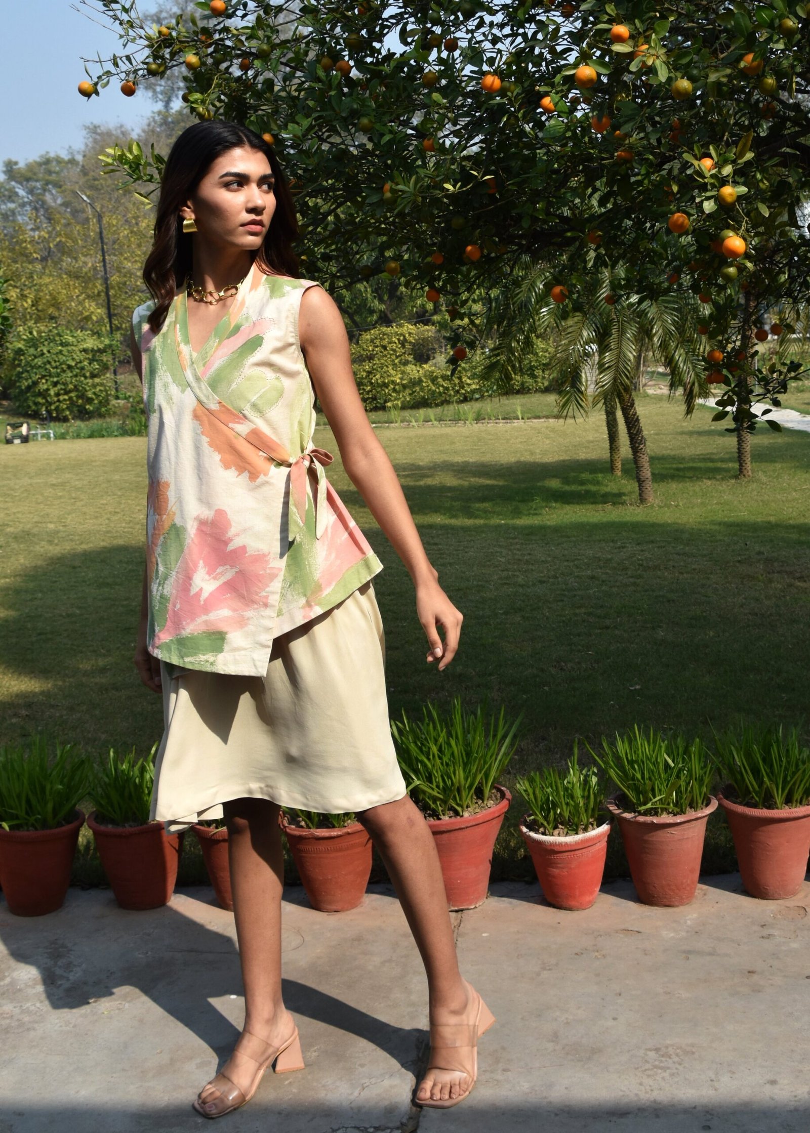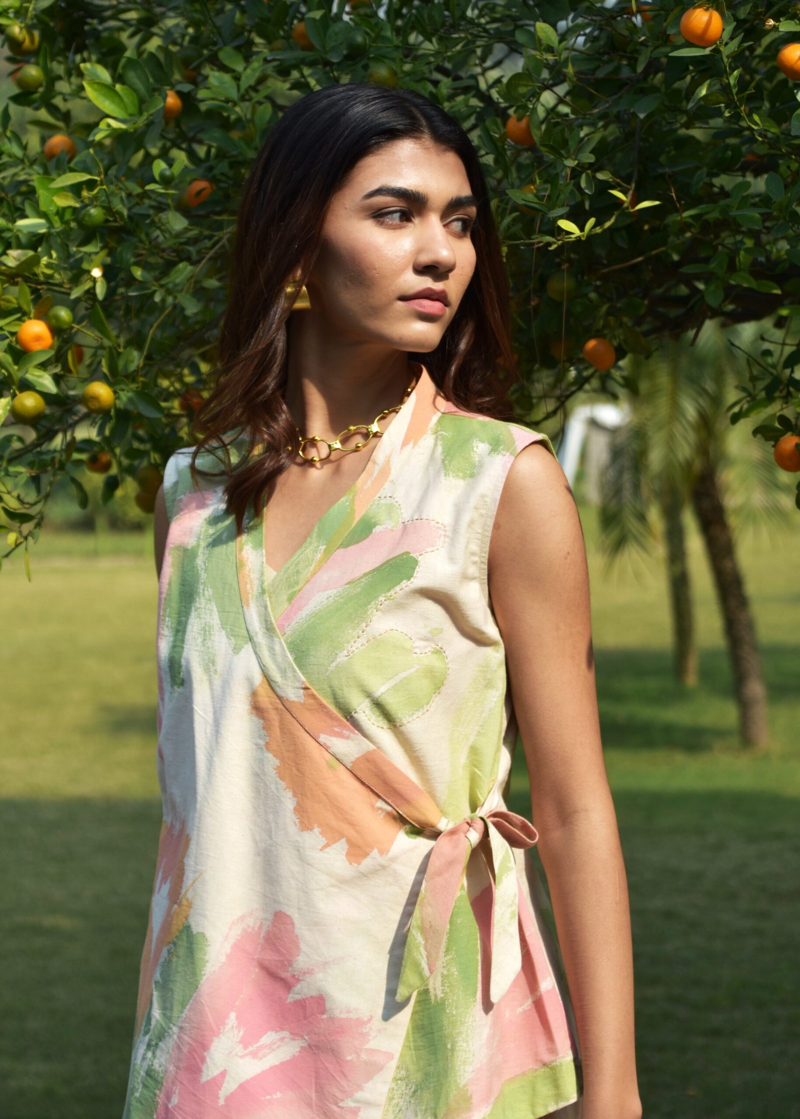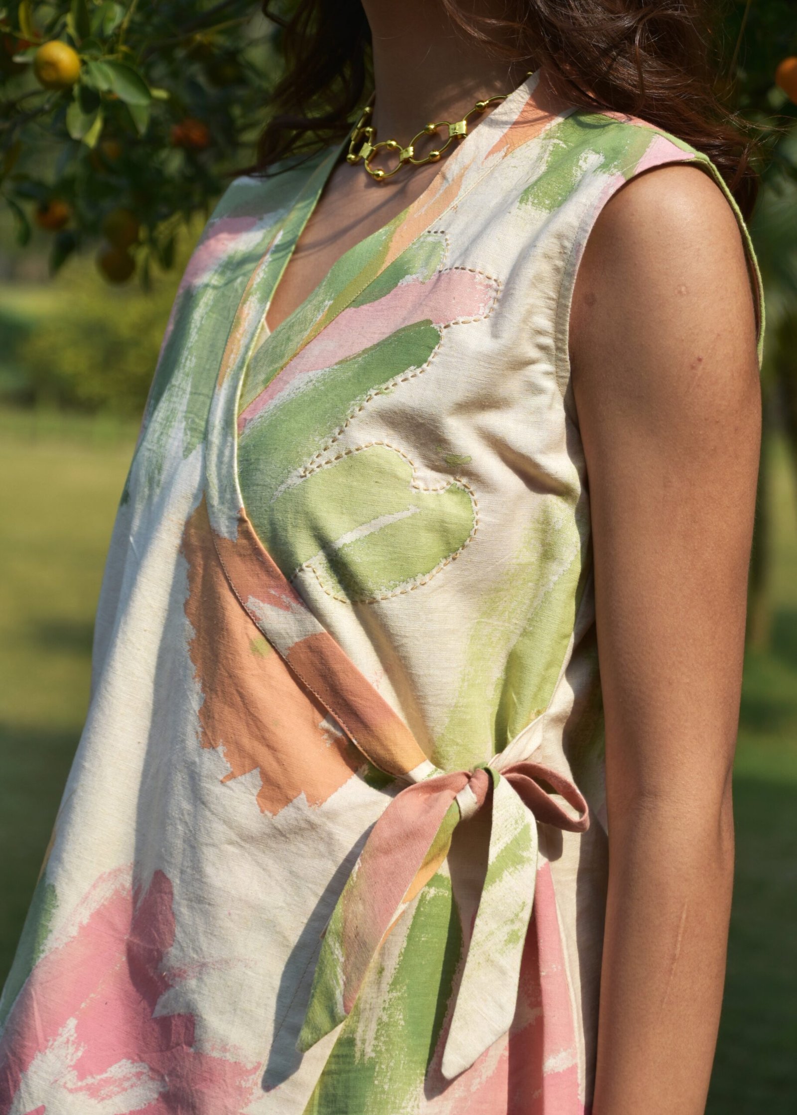 The jacket is designed to complement the dress. It features a striking knot detail on one side and kantha embroidery, adding a playful yet sophisticated touch to the piece.