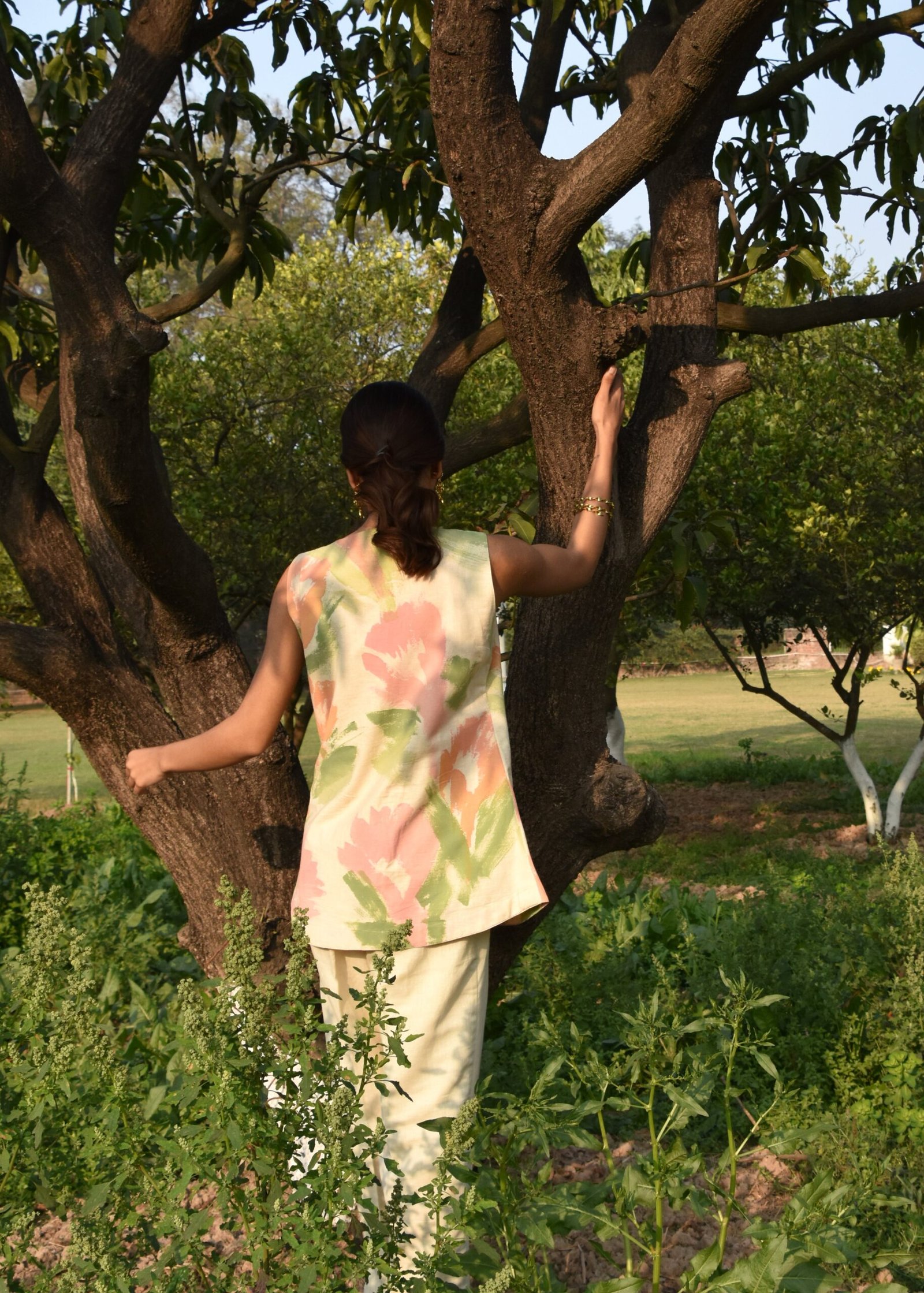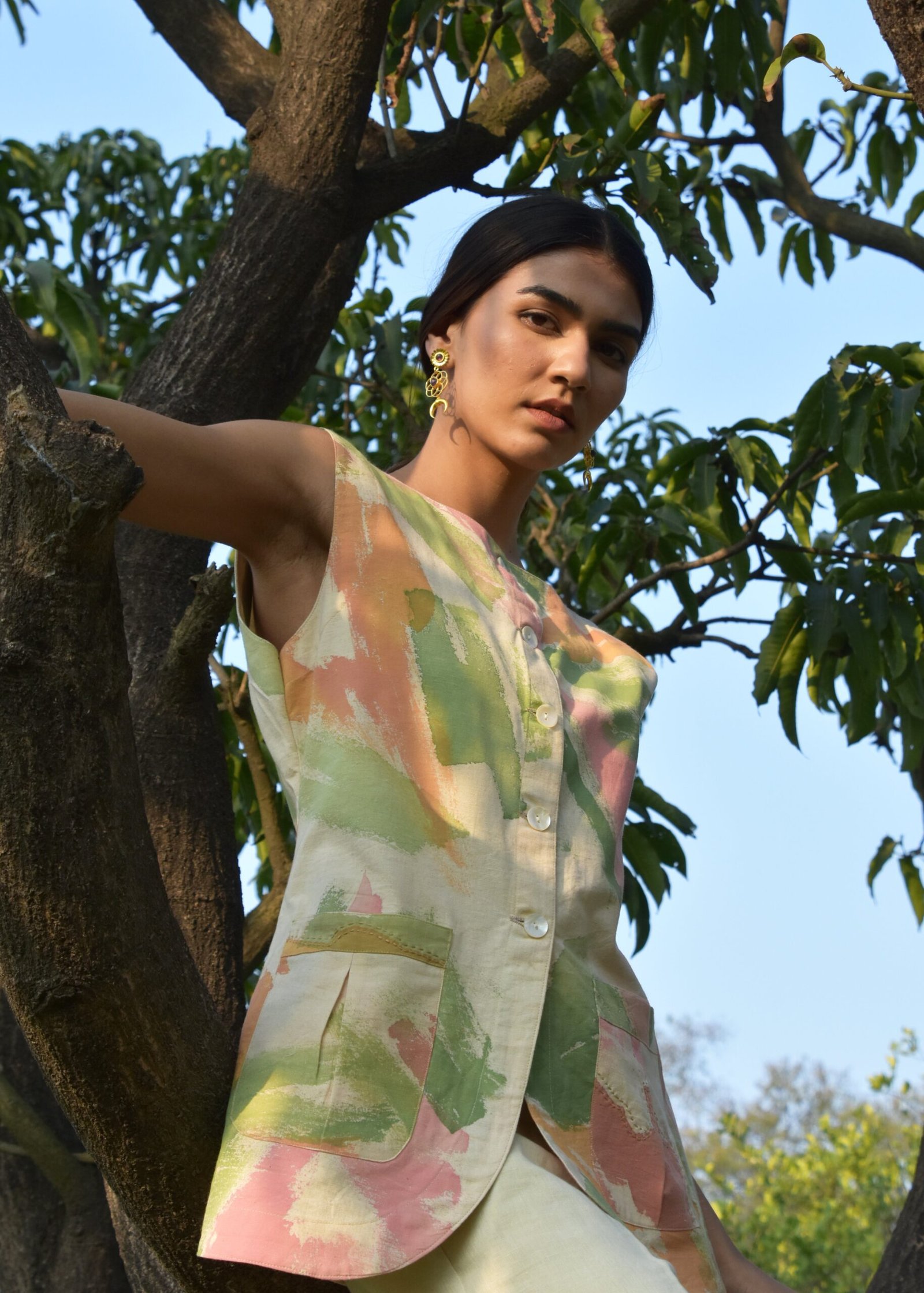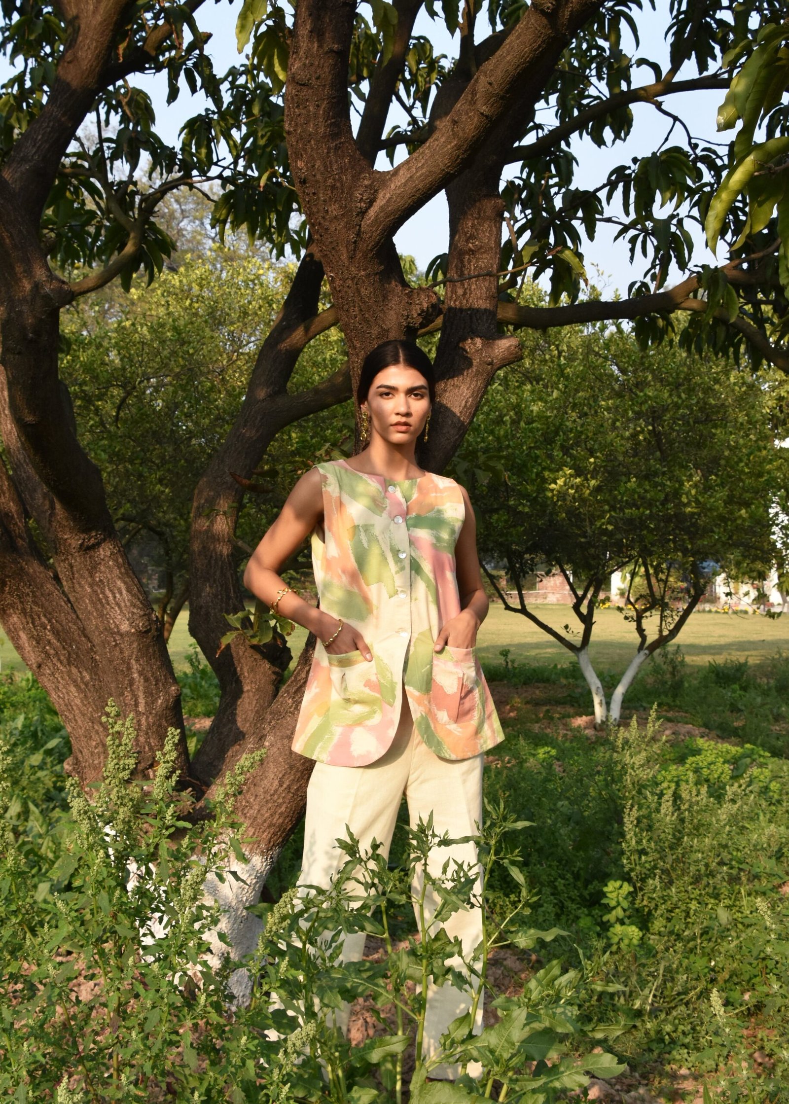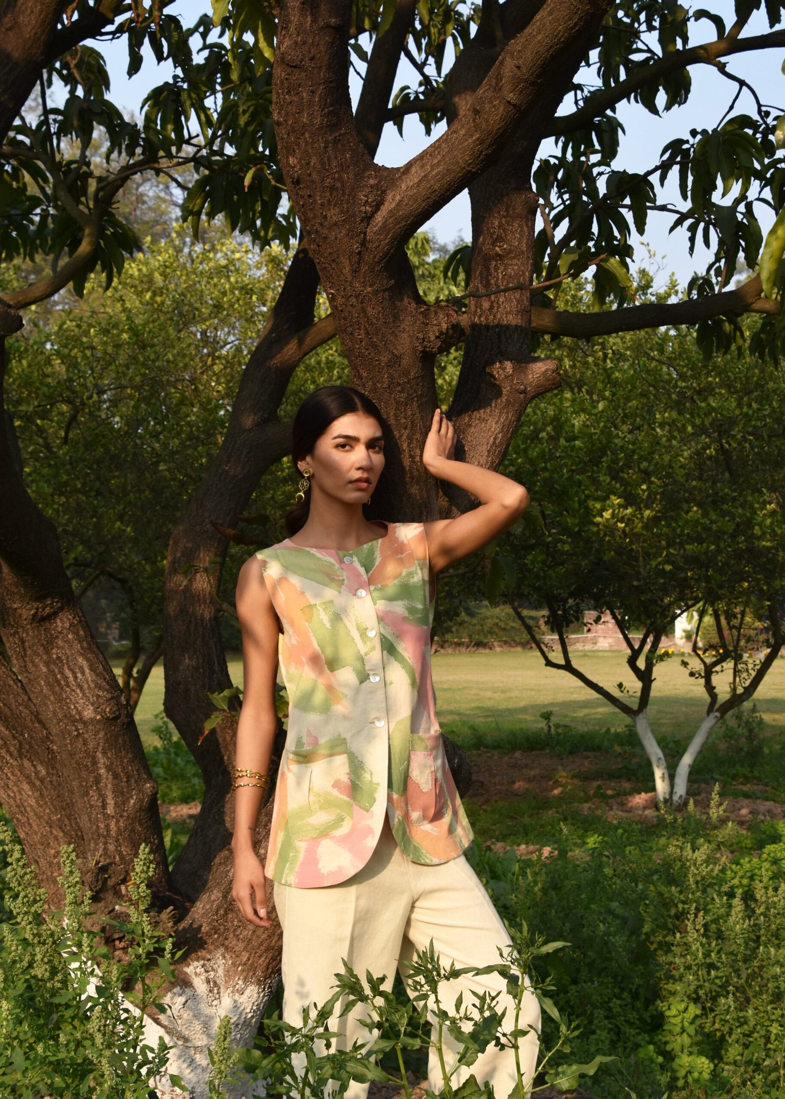 The linen co-ord set features a sleeveless, jacket-like top that exudes an effortless vibe. The top is designed with functional front pockets, adding both practicality and style. The buttons down the front add a classic touch to the contemporary look. Paired with tonal pants, the set creates a harmonious and coordinated look.
