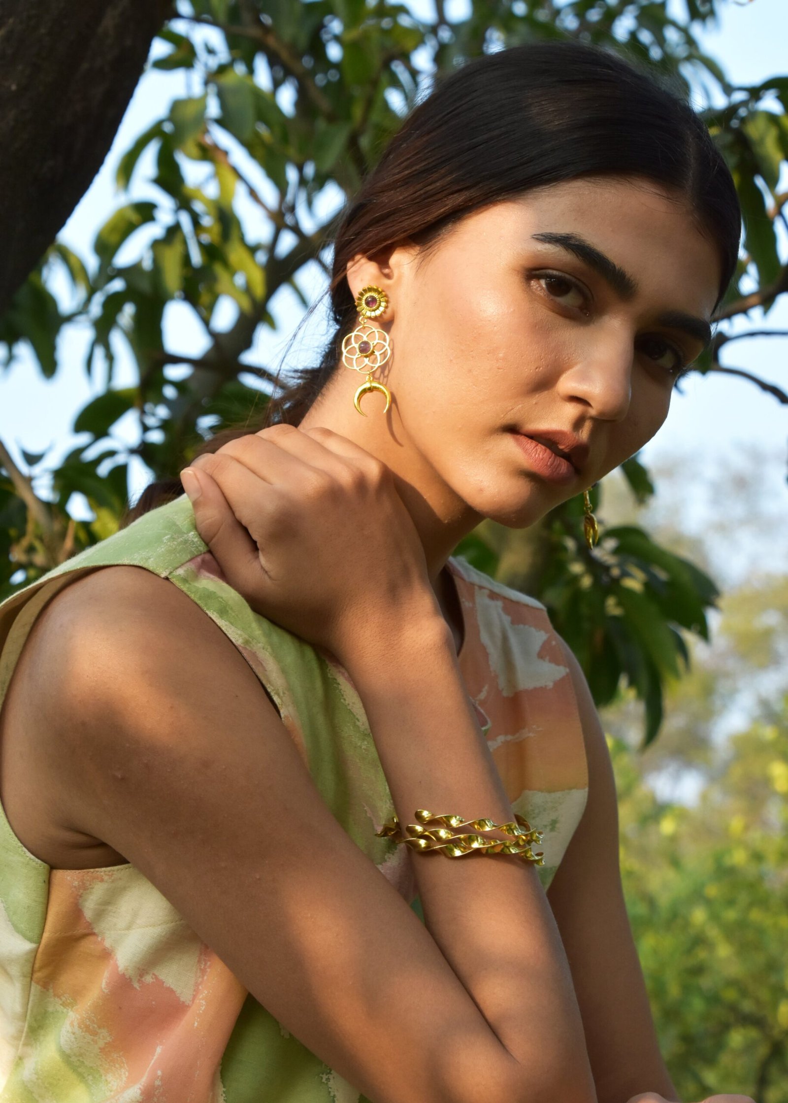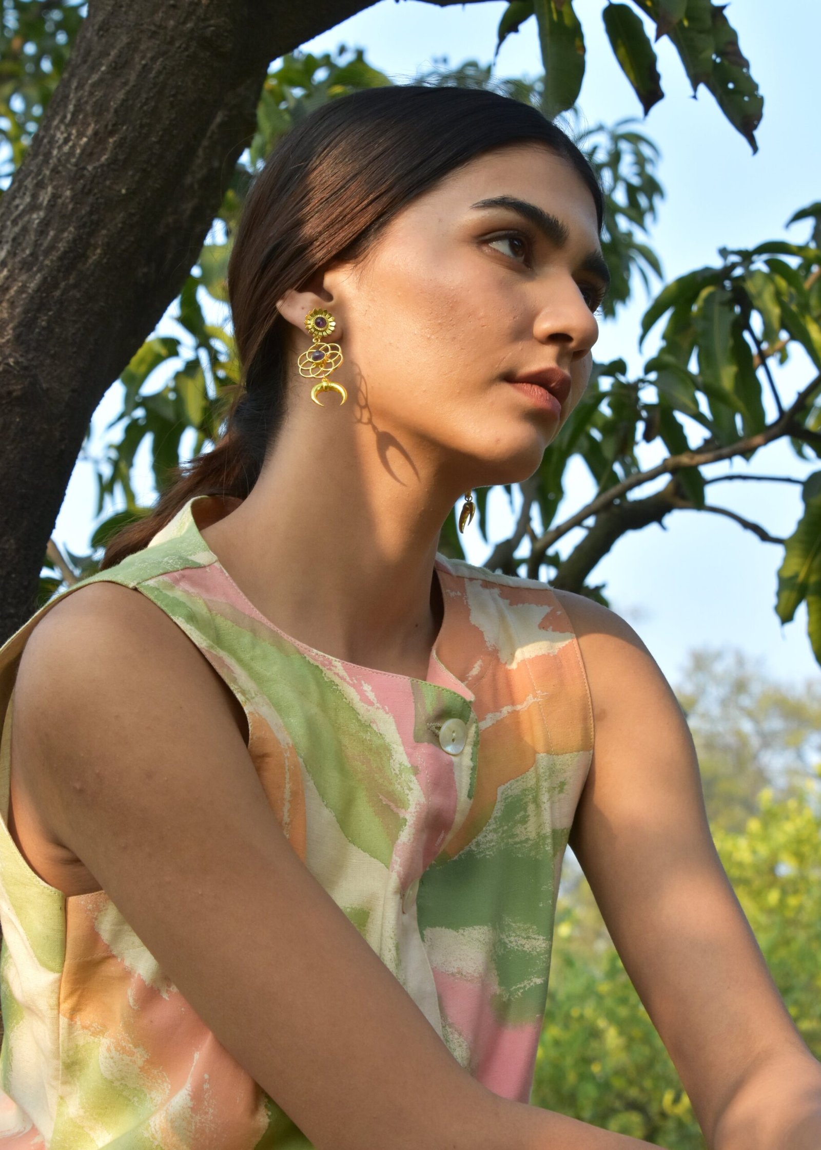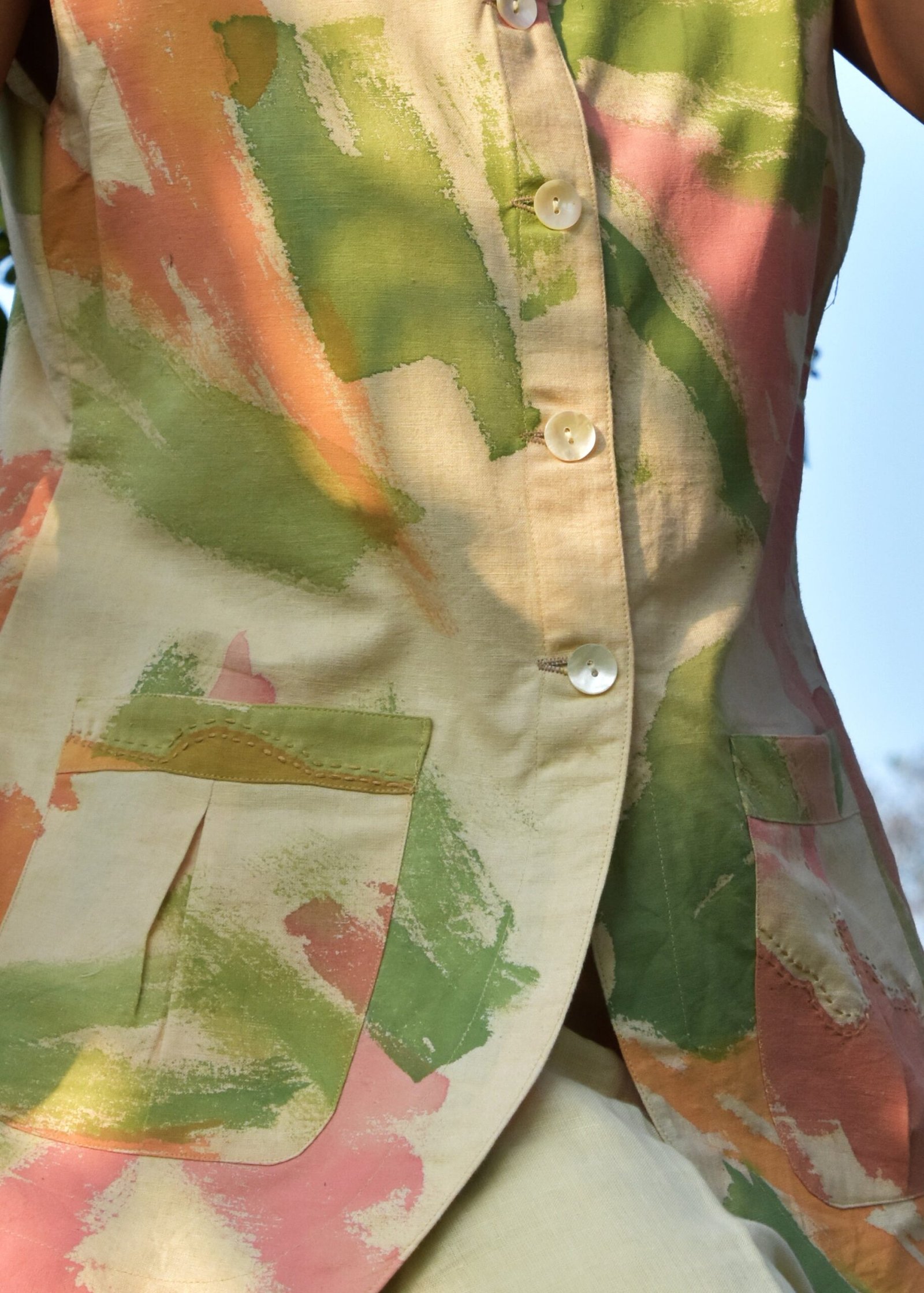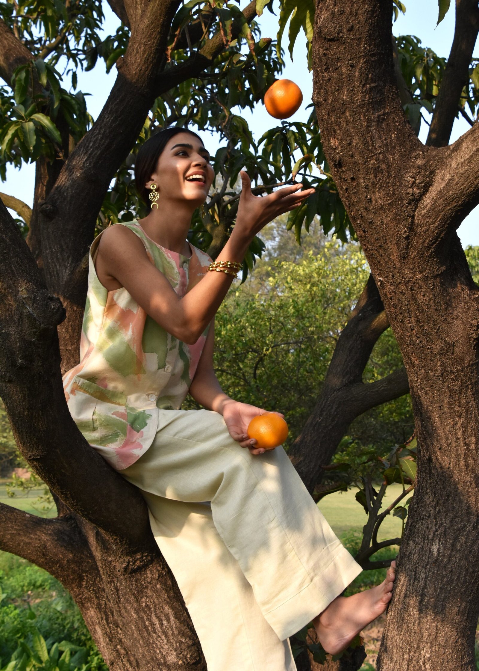 The linen co-ord set features a sleeveless, jacket-like top that exudes an effortless vibe. The top is designed with functional front pockets, adding both practicality and style. The buttons down the front add a classic touch to the contemporary look. Paired with tonal pants, the set creates a harmonious and coordinated look.