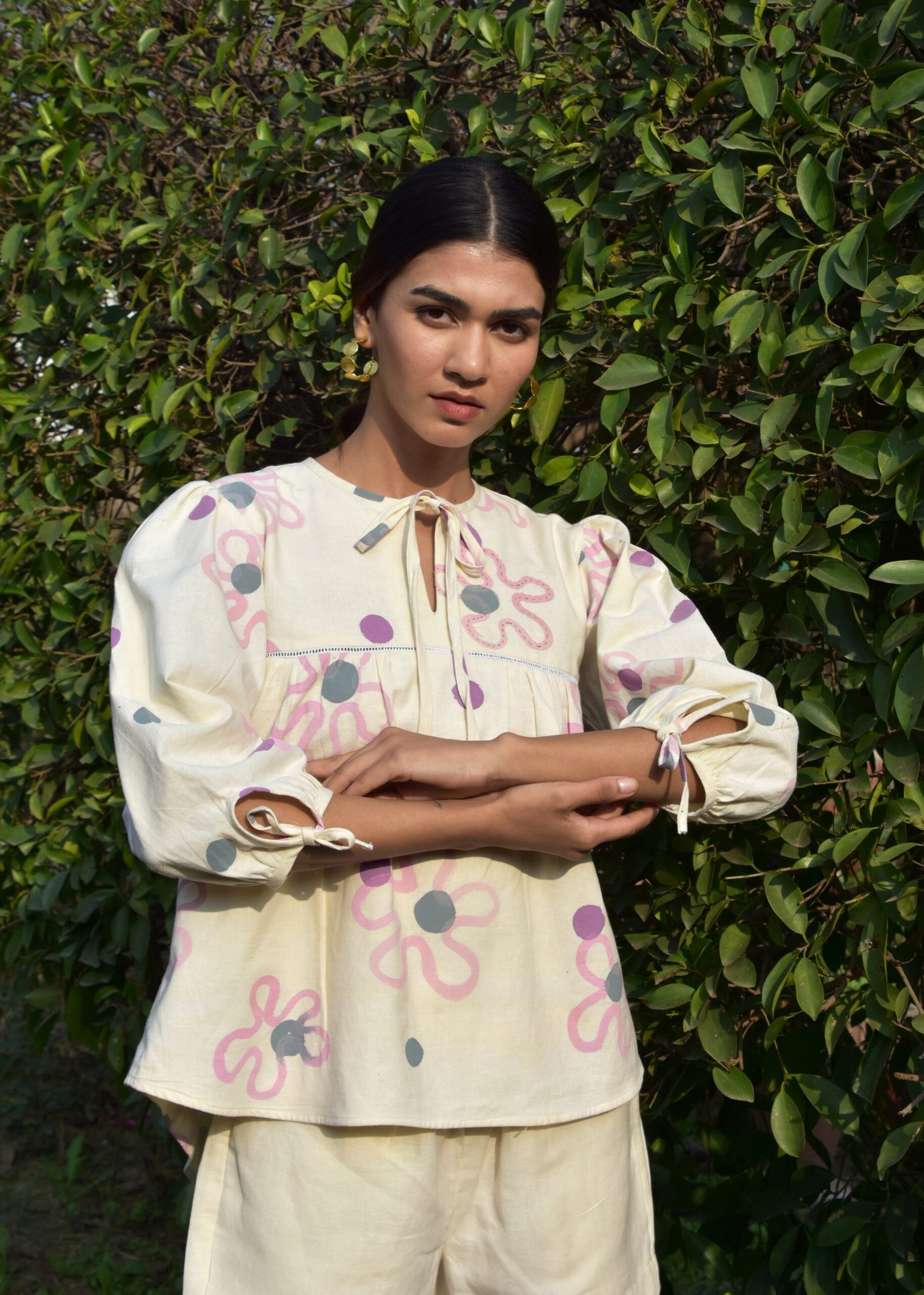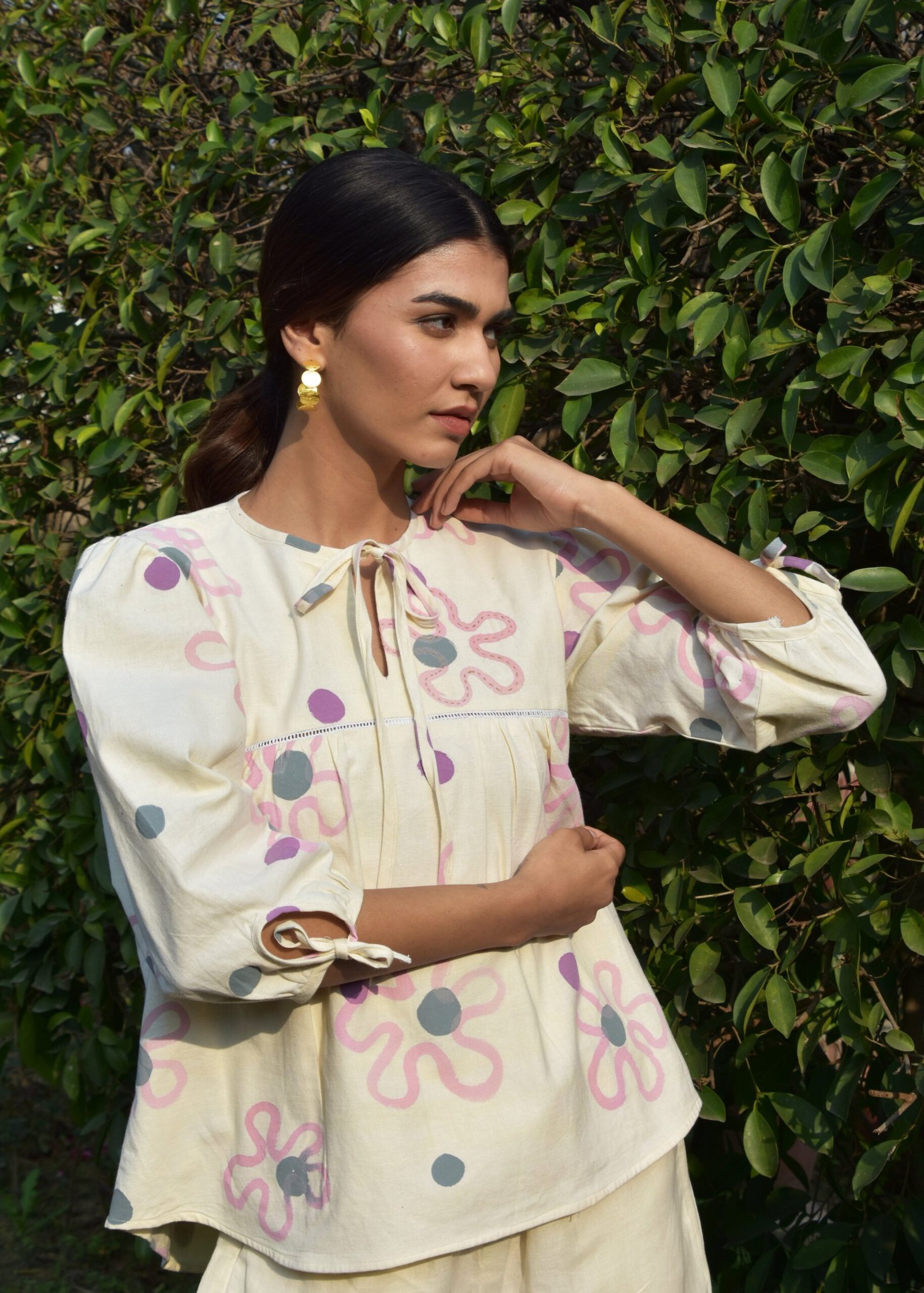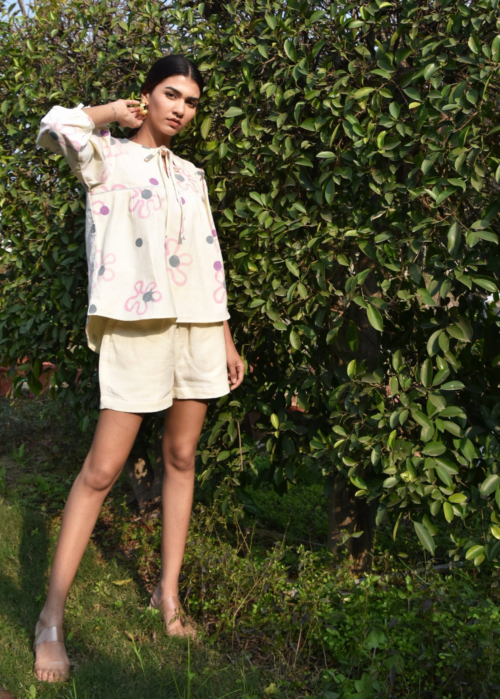 This linen coord set features a top adorned with childlike ties at both the neck and sleeves, adding a whimsical, youthful touch. The shorts offer a relaxed, comfortable fit, balancing the playful nature of the top with ease. Together, the set exudes a lively, fun vibe.