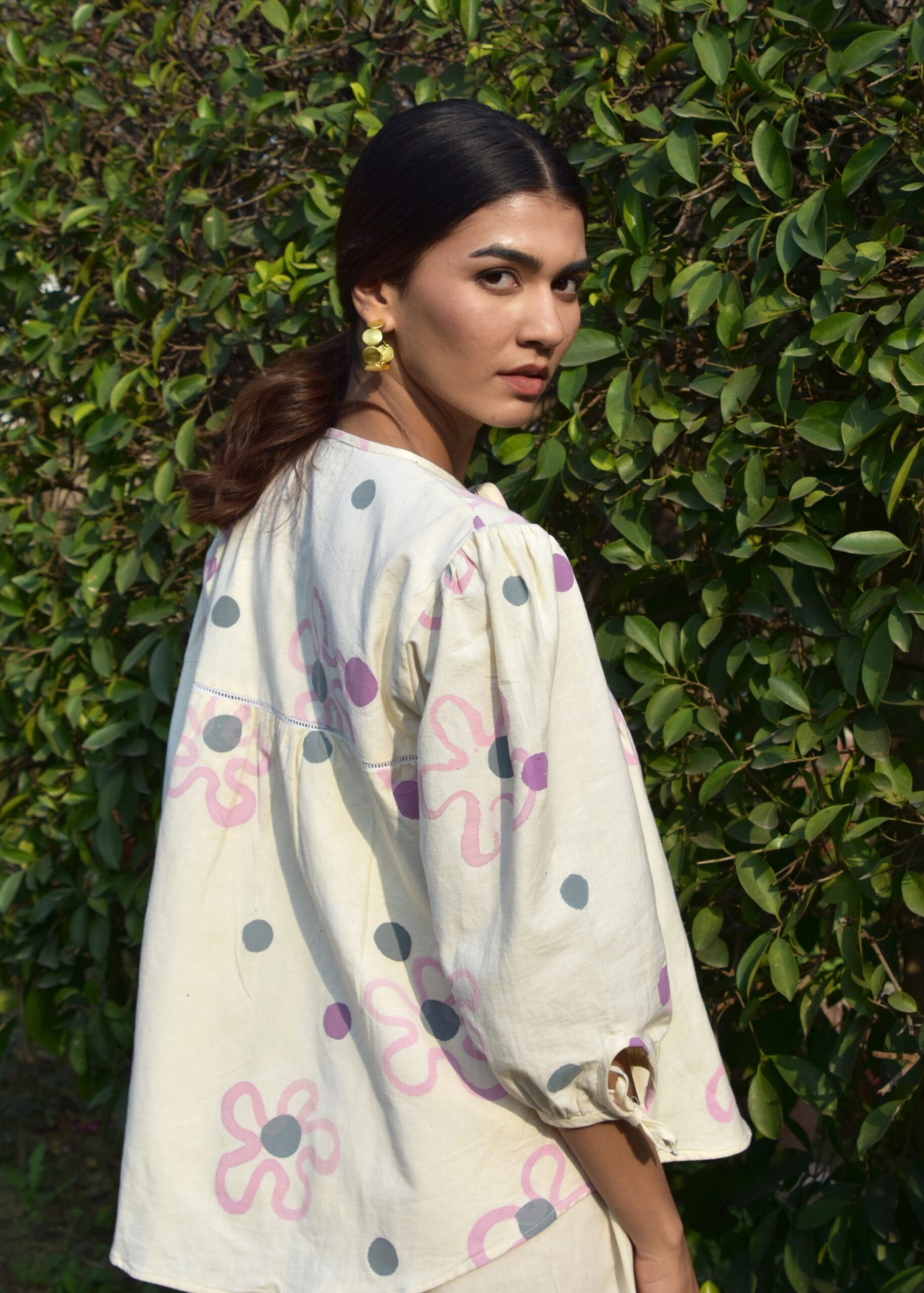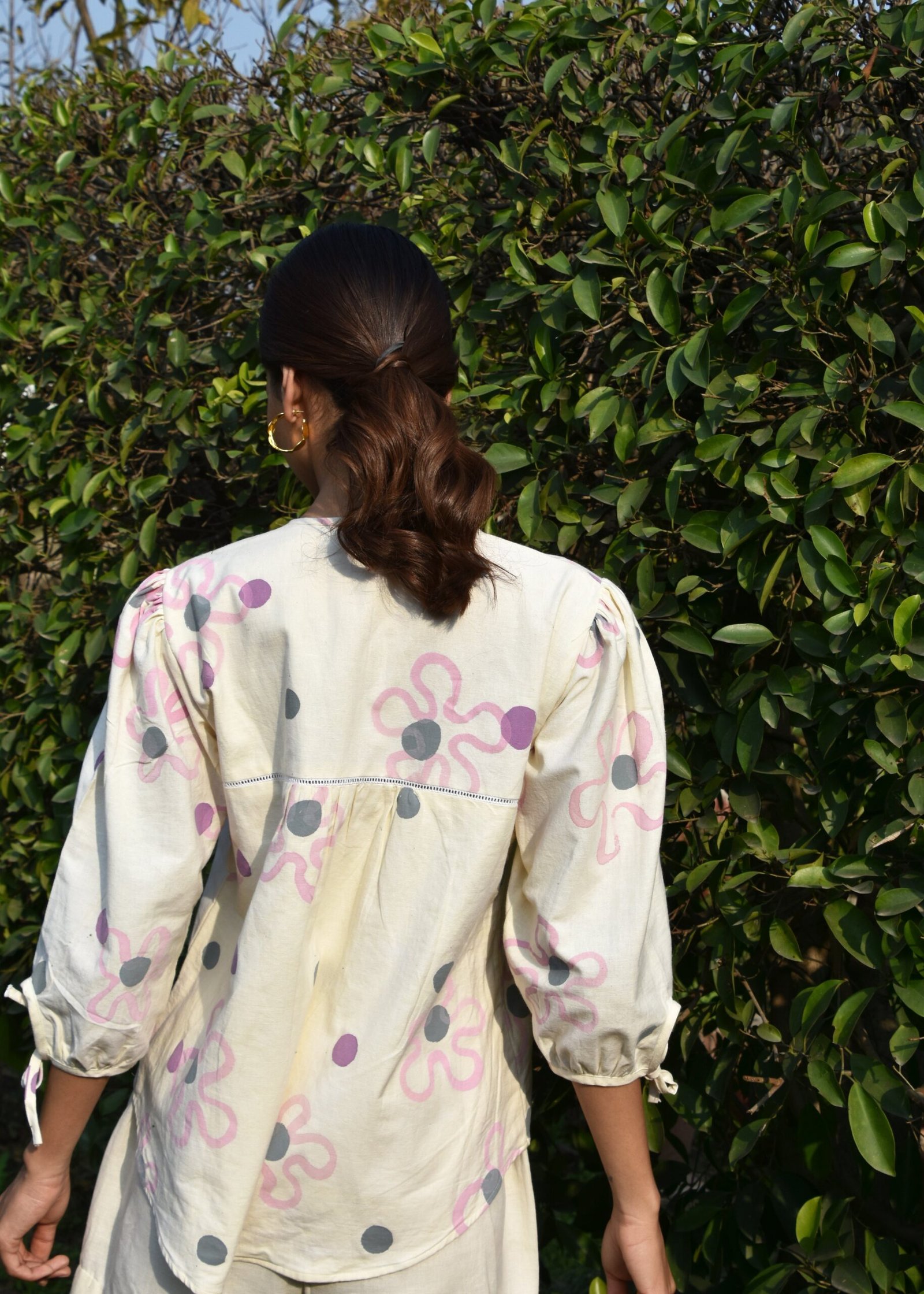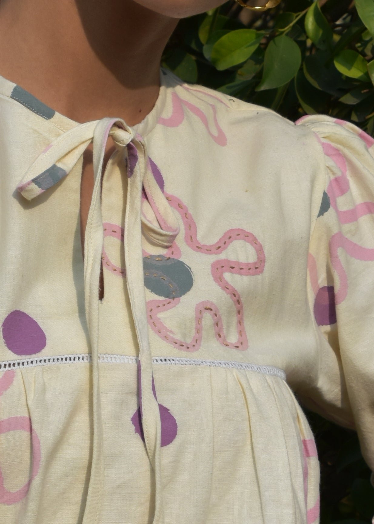 This linen coord set features a top adorned with childlike ties at both the neck and sleeves, adding a whimsical, youthful touch. The shorts offer a relaxed, comfortable fit, balancing the playful nature of the top with ease. Together, the set exudes a lively, fun vibe.