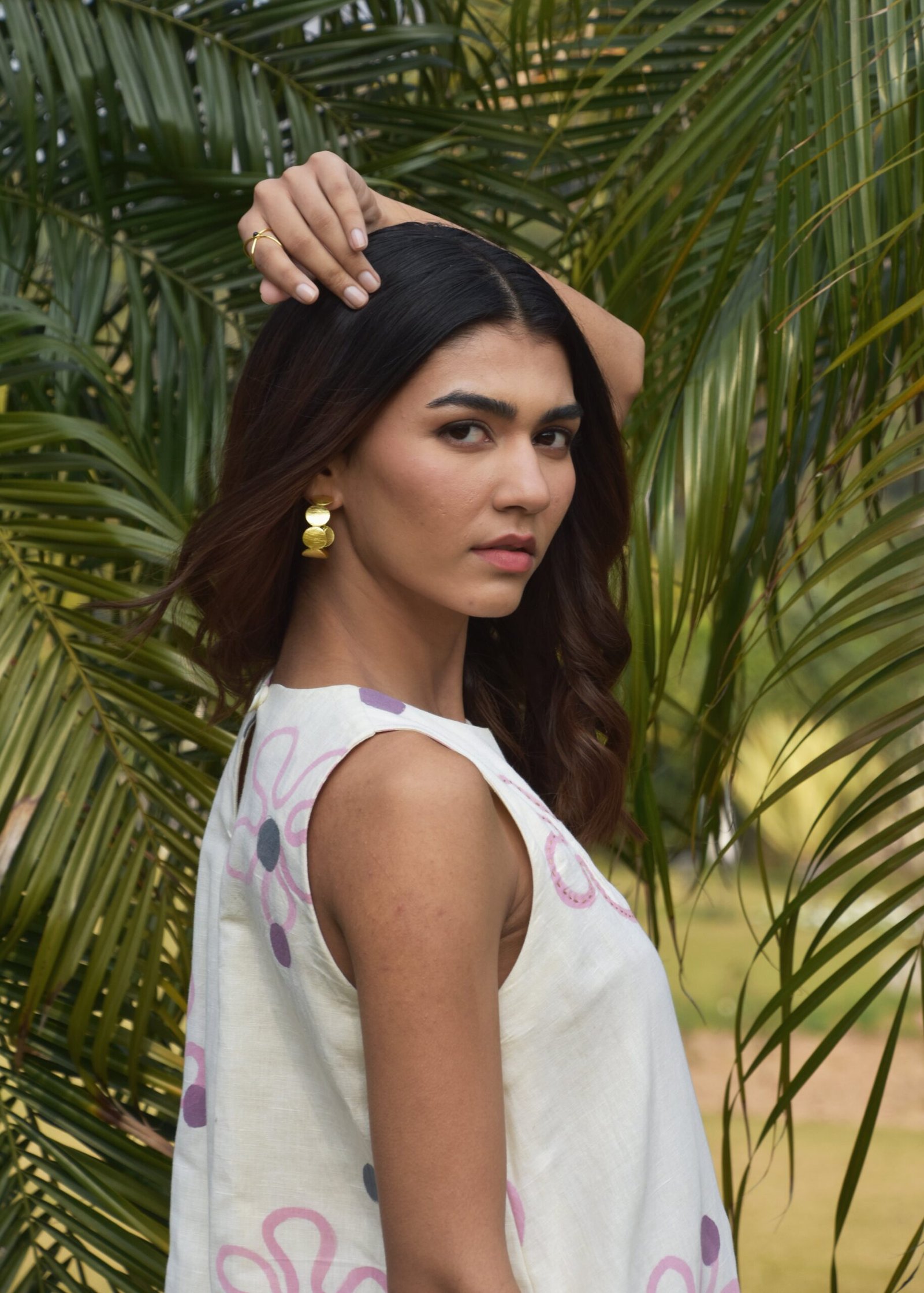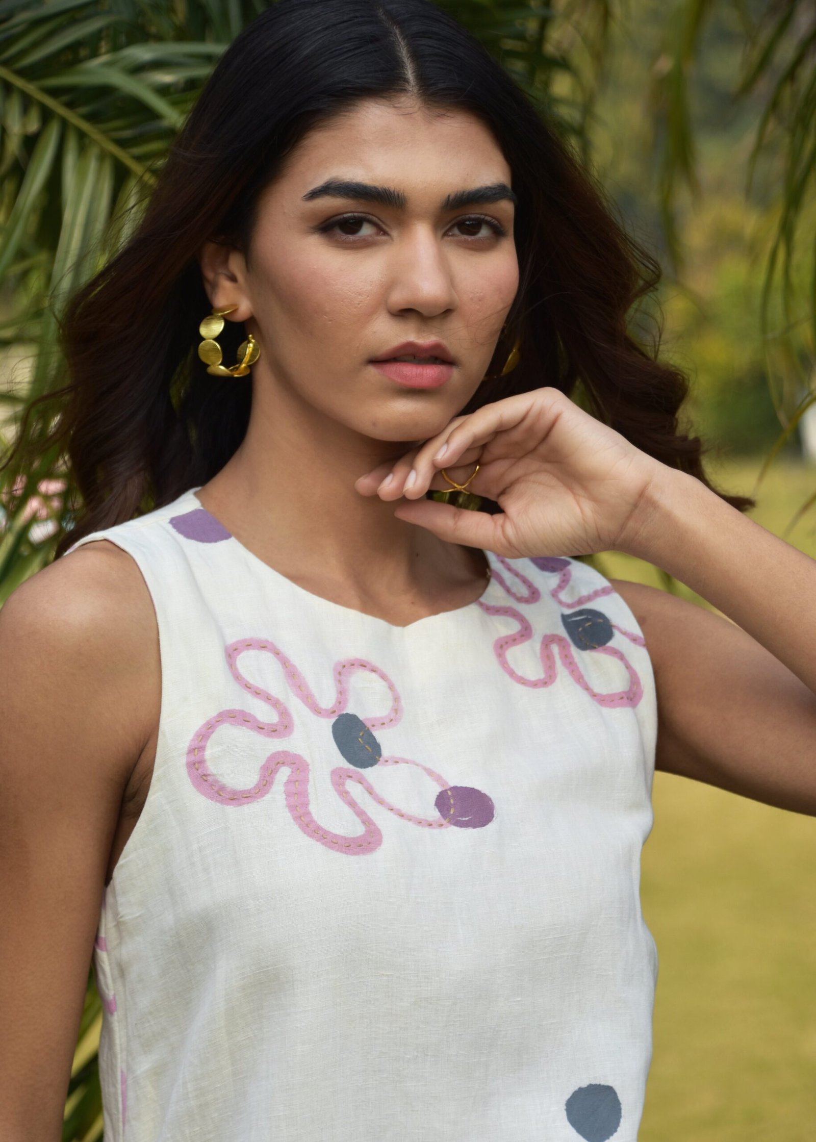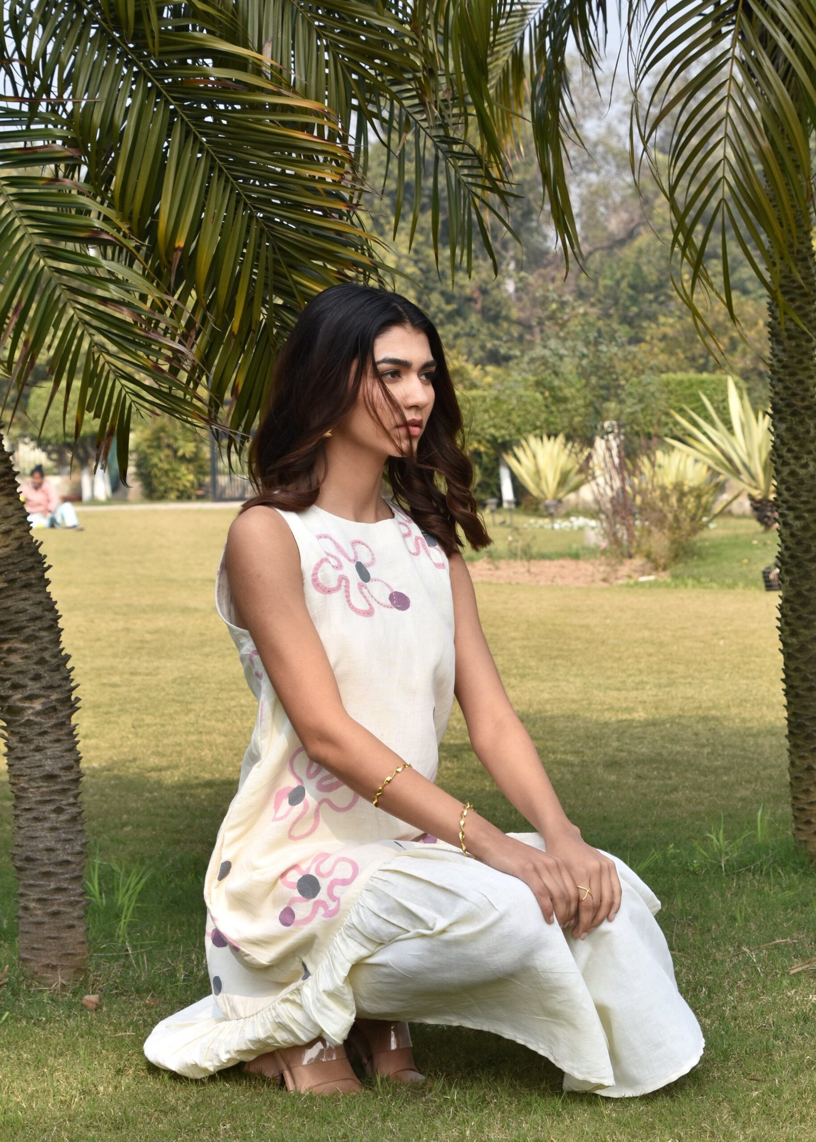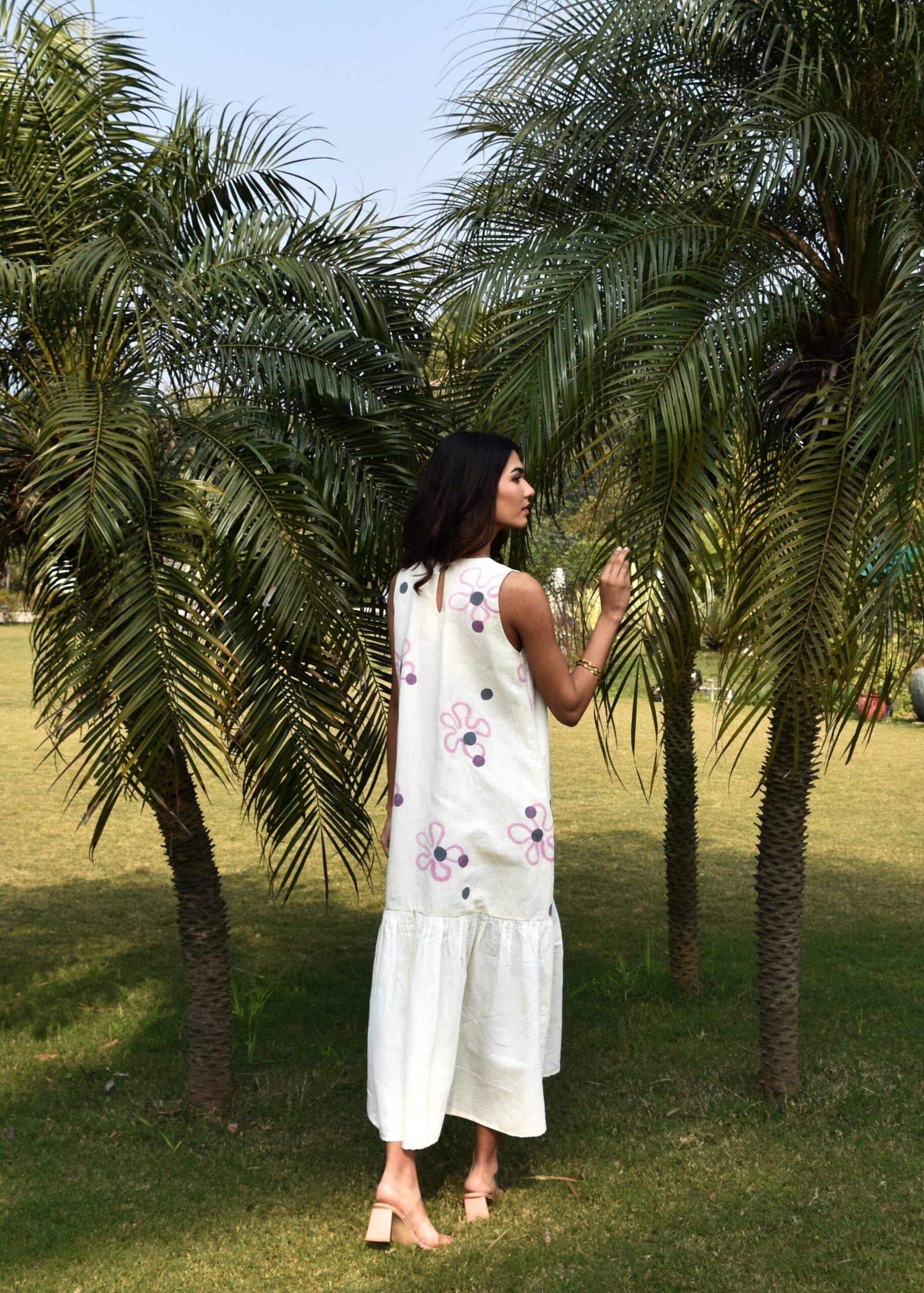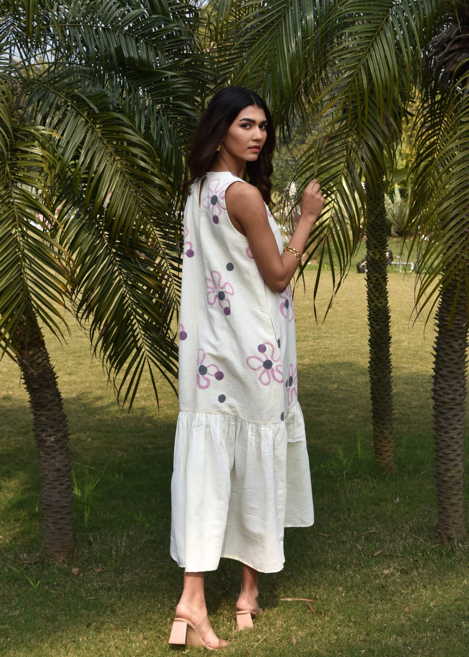 A chic calf-length linen dress, designed for effortless elegance and comfort. Featuring a sleeveless cut, it offers a relaxed, airy feel perfect for warm weather. The soft linen fabric drapes beautifully, with delicate ruffles towards the bottom. The dress is enhanced with kantha embroidery at the top.