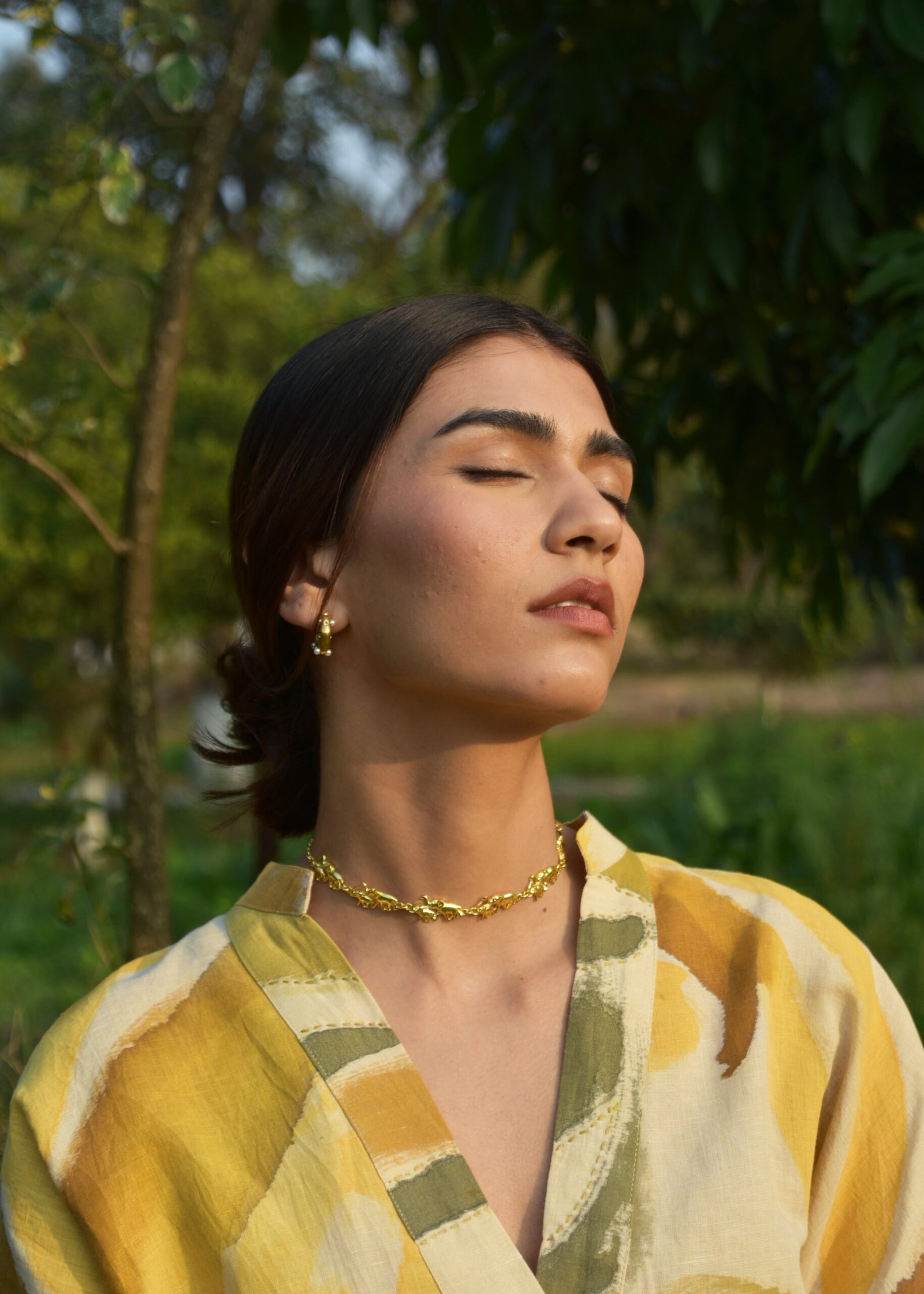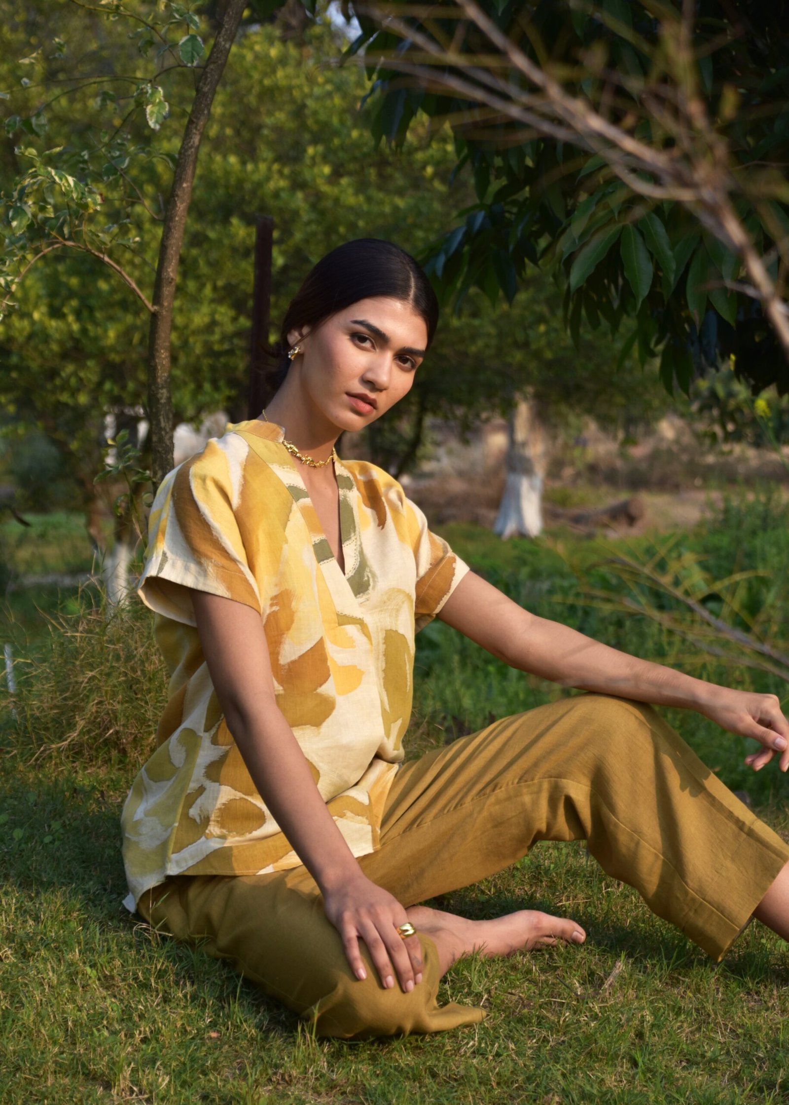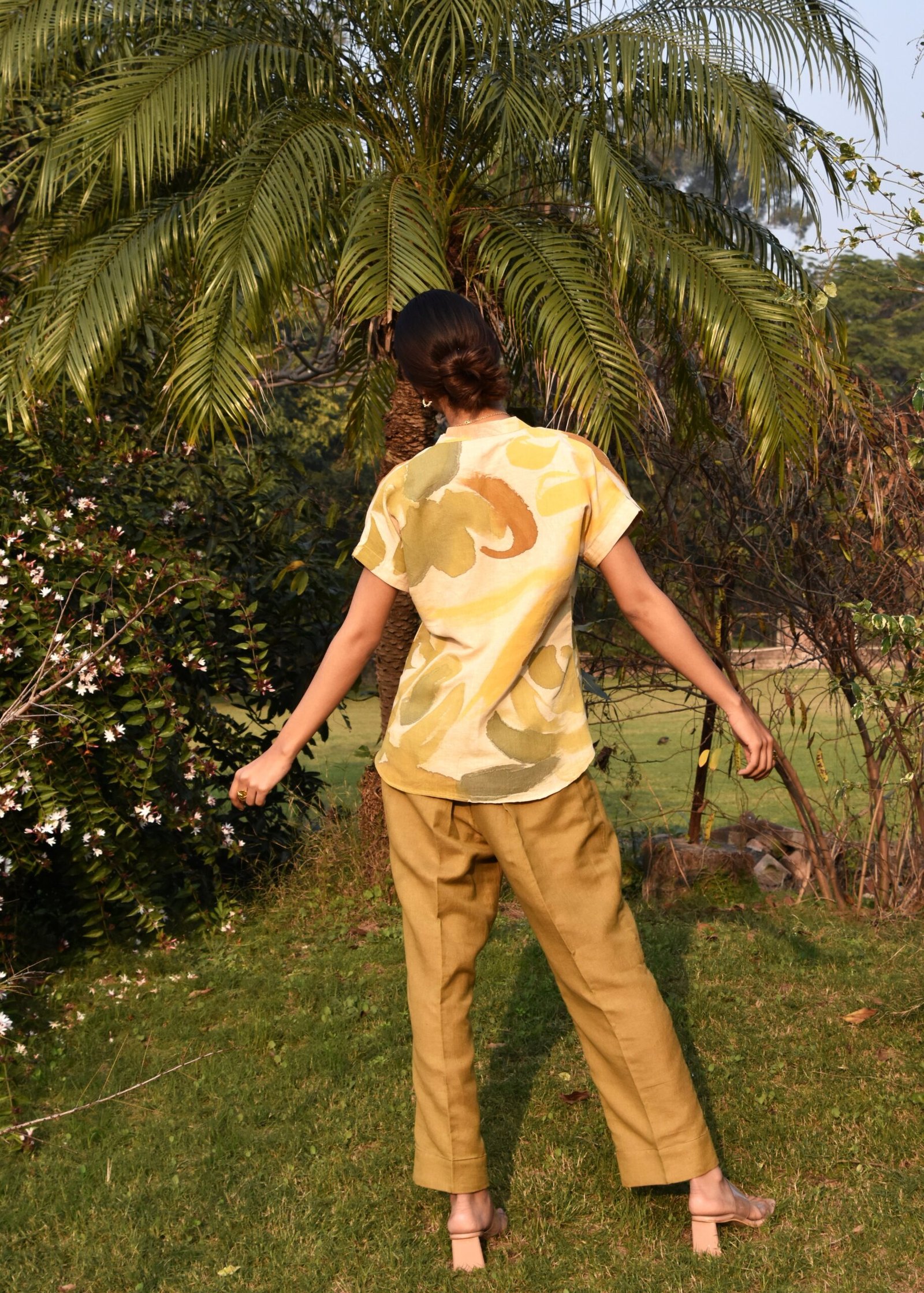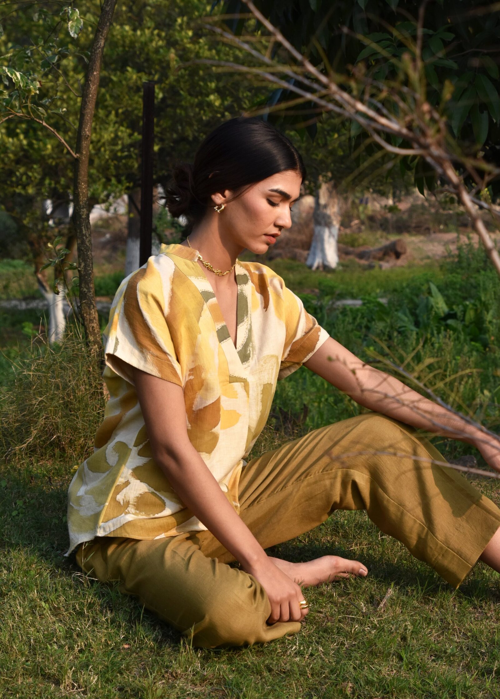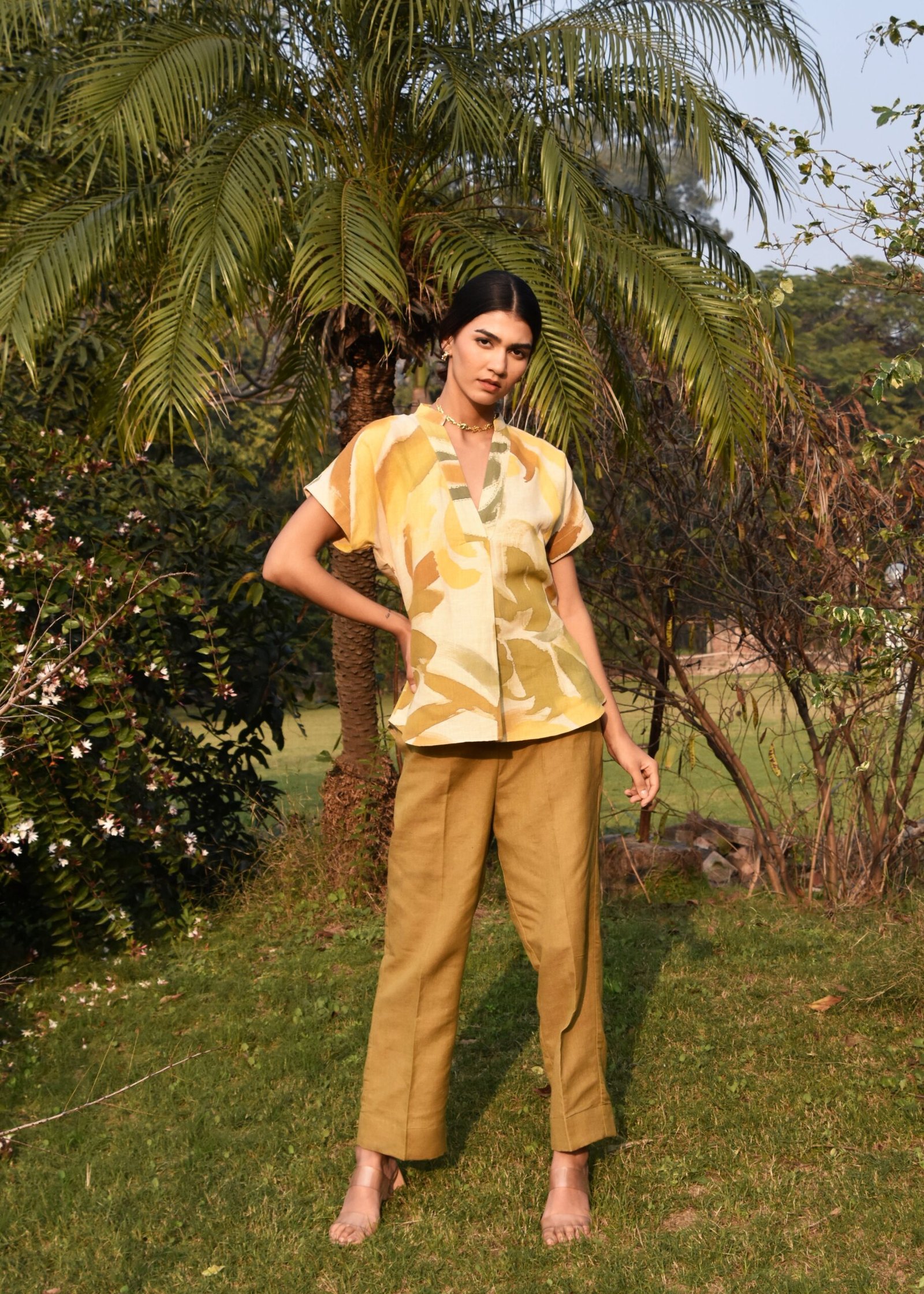 The linen coord set features a top with an innovative design, showcasing a sleeve that flows seamlessly. The standout detail is the intricate kantha embroidery along the neck. The co-ord set is complimented with contrast khakhi coloured pants.