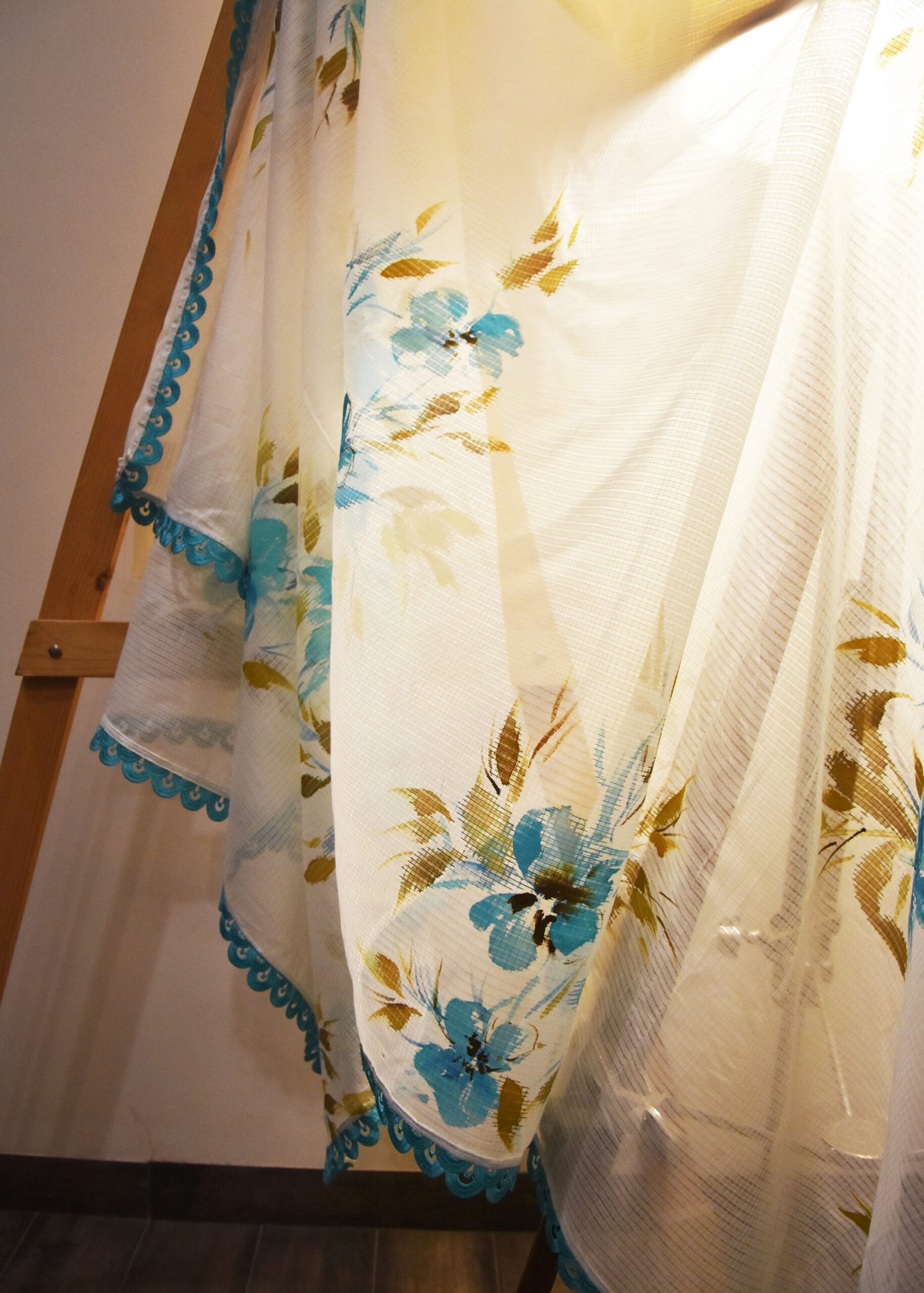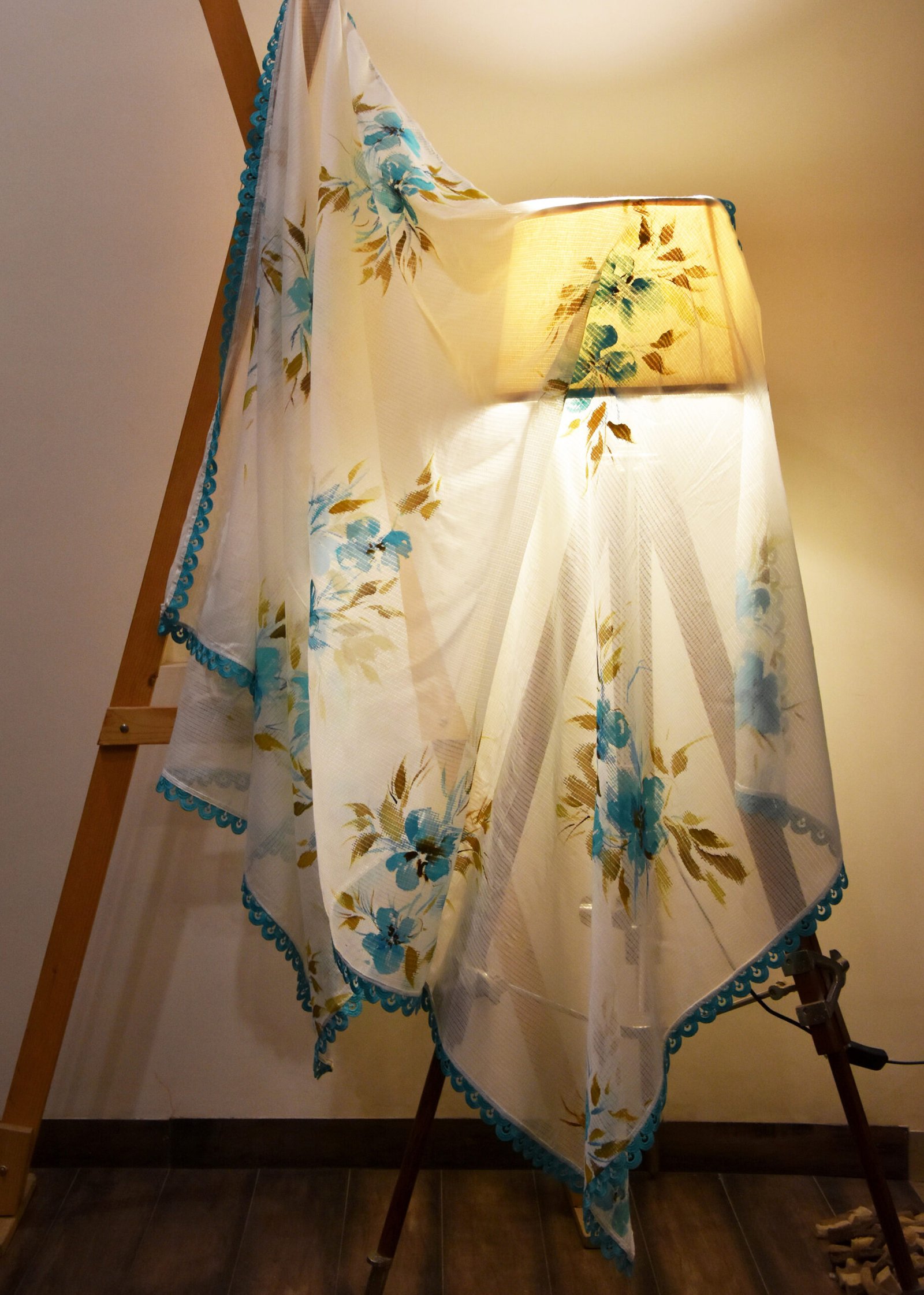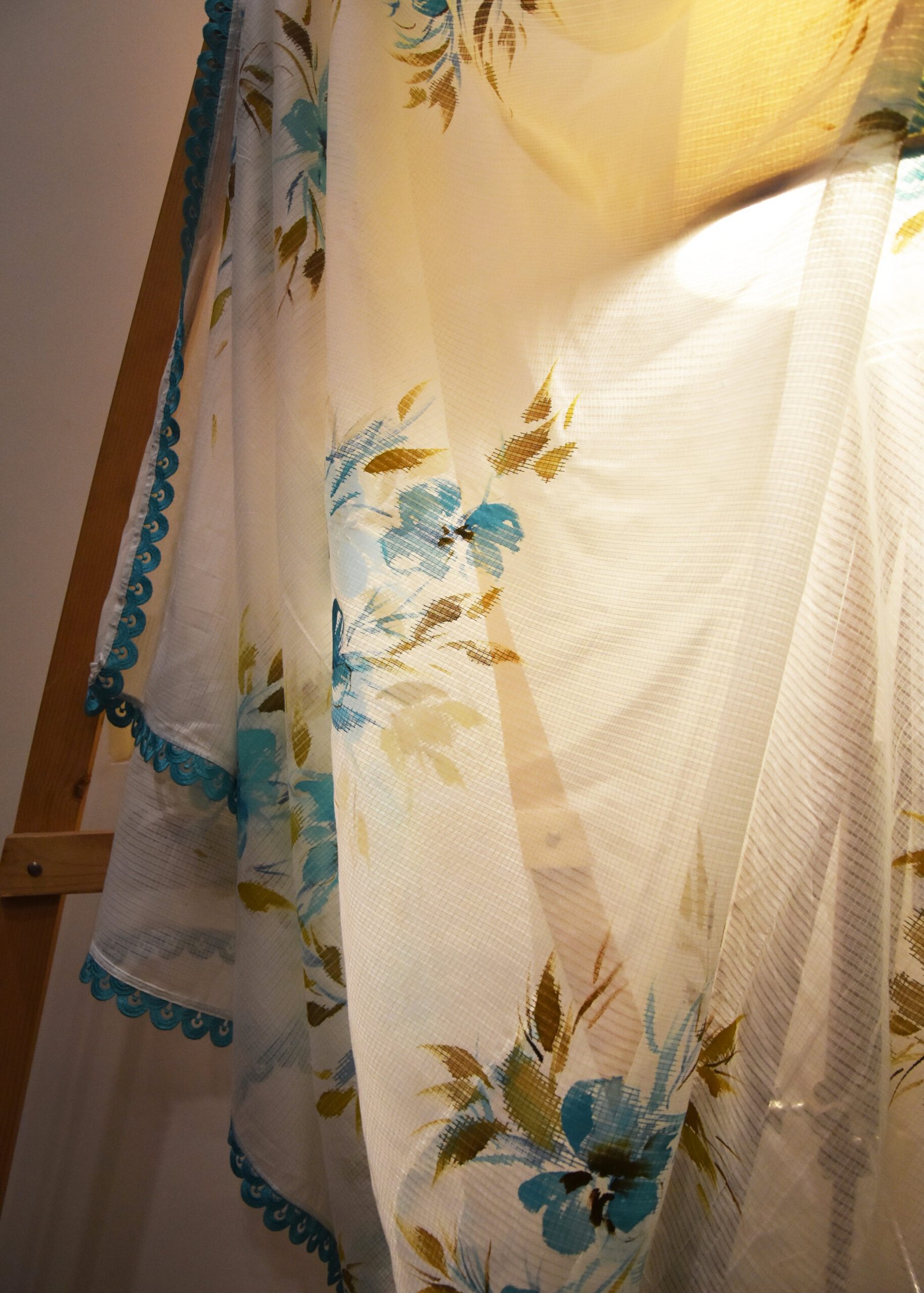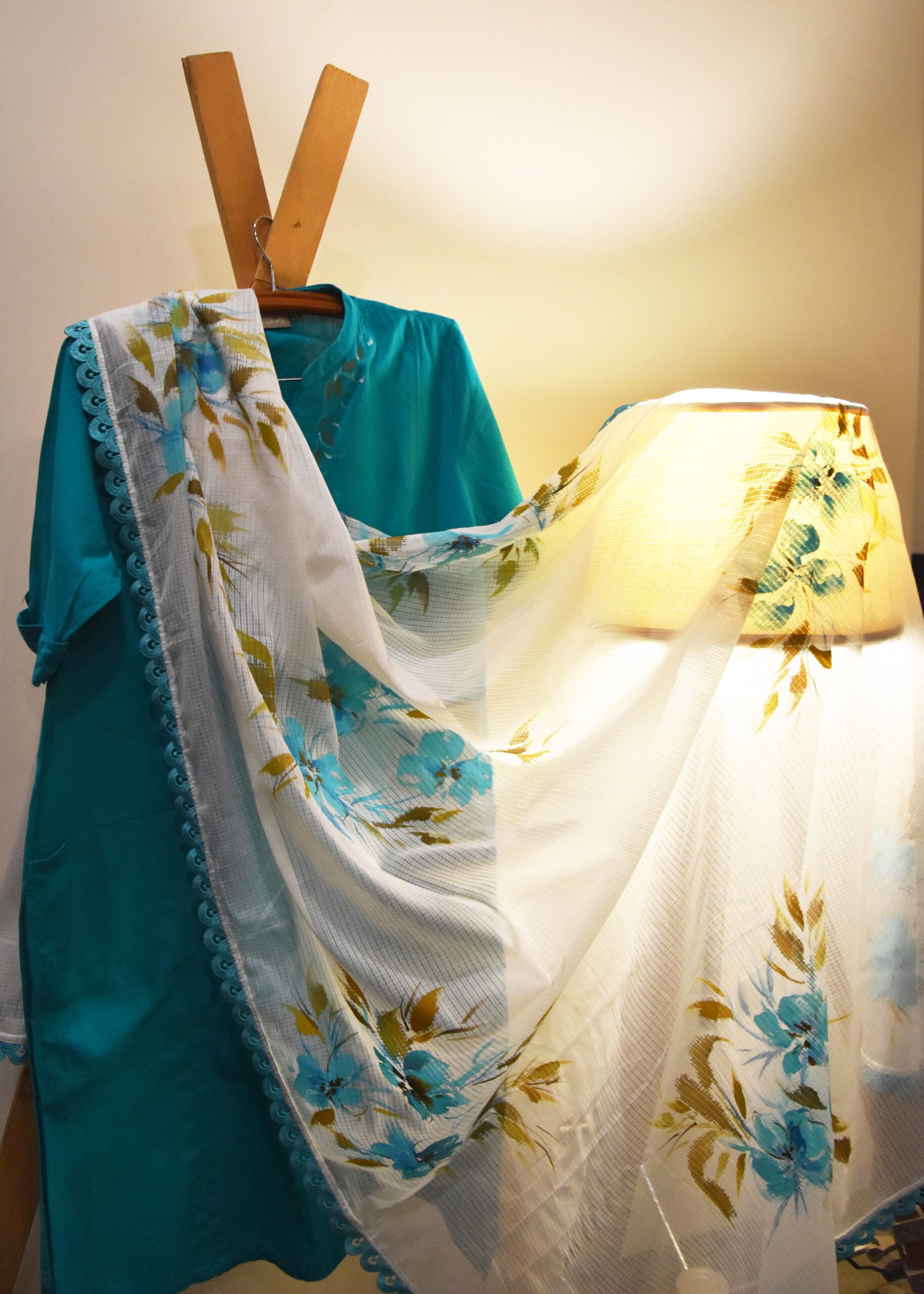 The scarf/dupatta has hand-painted spread of turquoise floral bunches. It is made in a soothing summery kota fabric. The dupatta/scarf is soothing, sheer and as fresh as the flowers.
